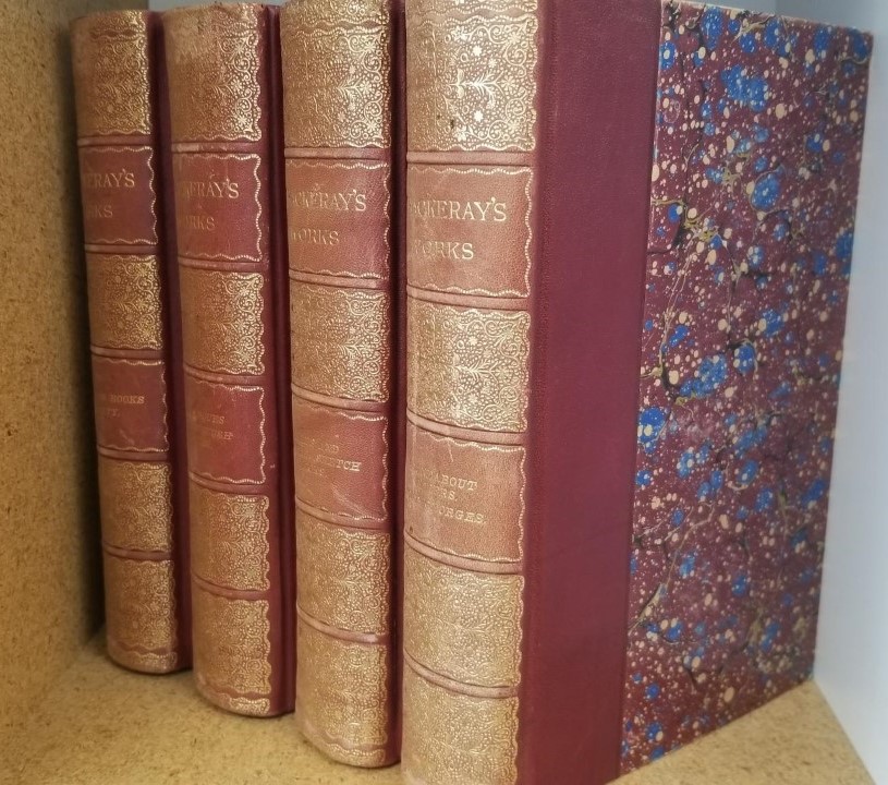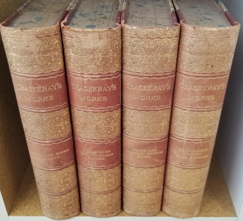 Thackeray’s Complete Works. [four half-leather bindings] The spines of these four volumes are stunningly beautiful with gold design.