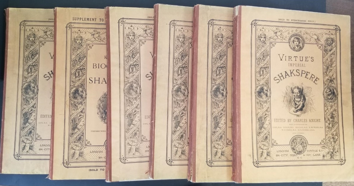 The Works of Shakspere (Imperial Edition) Vols 1, 2, 3, 6,7 & Supplement (6 Volumes). Virtue’s Imperial Shakspere, Edited by Charles Knight, with Illustrations by Cope, R. A., Leslie, R. A., Maclise, R. A., E. M. Ward, R.A, W. P. Frith, R. A., H. S. Marks, A. R. A. and Others. London Virtue & Company