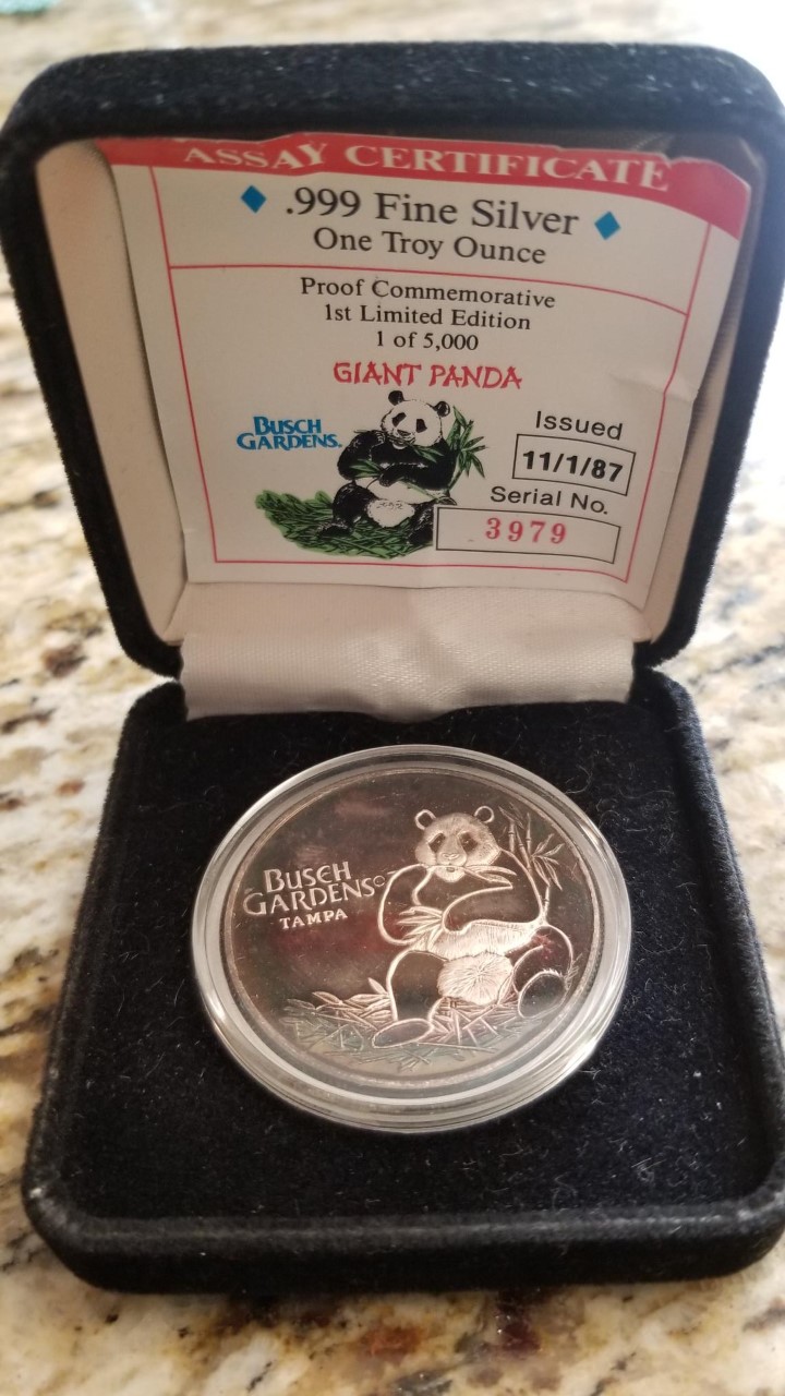 11/1/87 — Busch Gardens Giant Panda Proof Commemorative Silver Coin — In Box
