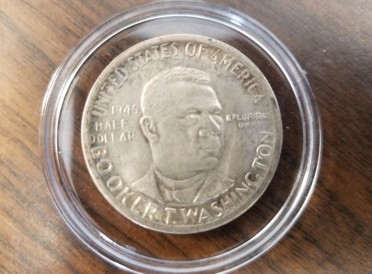 1946-S Silver Half Dollar — Booker T. Washington — “From Slave Cabin to Hall of Fame” — Booker T. Washington Birthplace Memorial