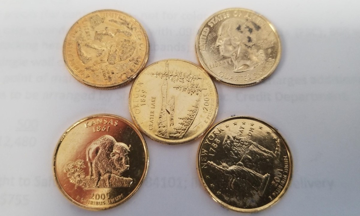 5 Gold-Plated State Quarters — Lot of 5 Coins — New York, Kansas, Massachussetts, Illinois, Oregon