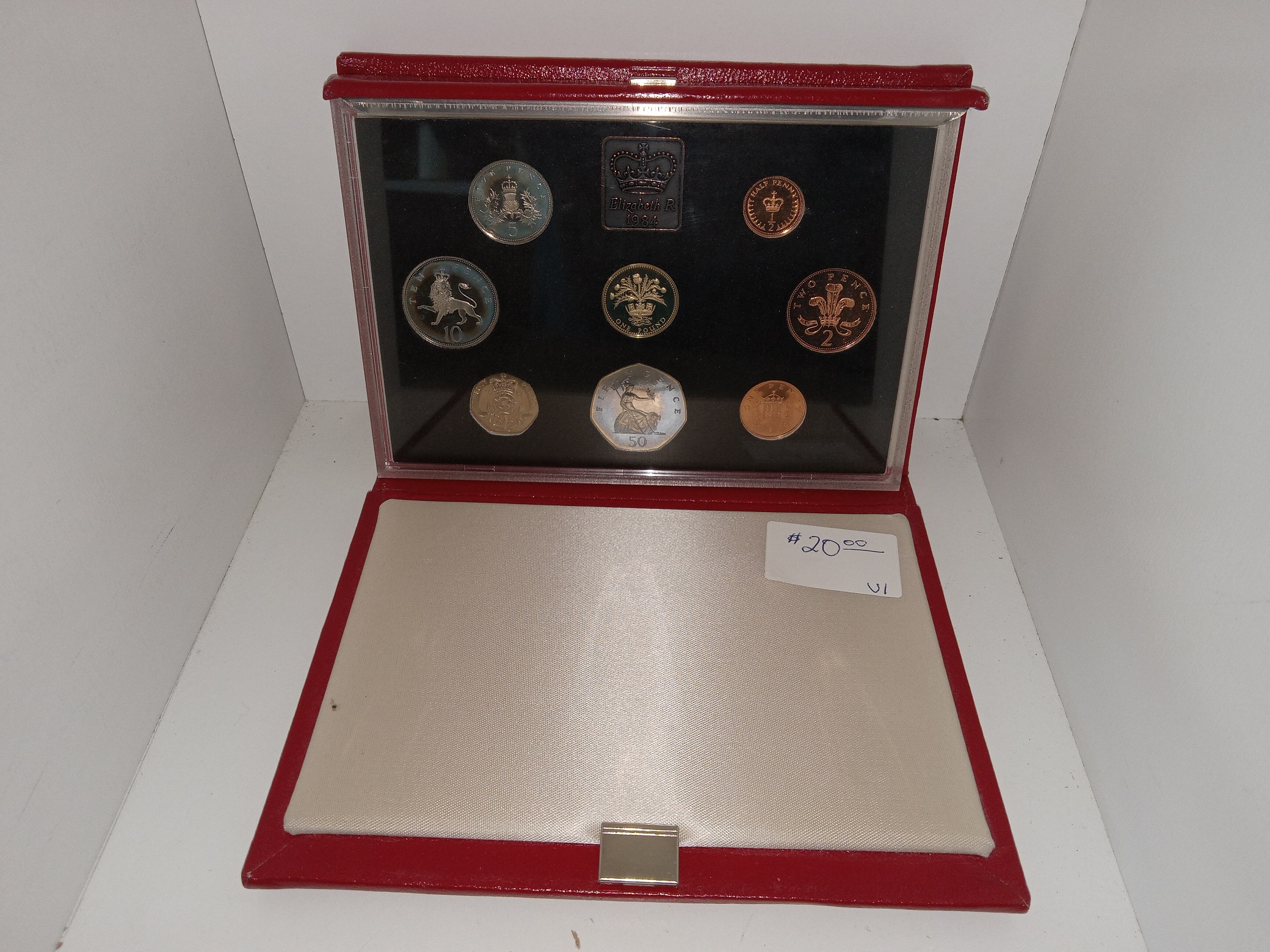 8 coins kept within their original case, the coins being in pristine condition. The case has some tiny dents on the outside, and the cushion on the inside of the case has some tiny stains, and a scratch.