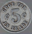 Metallic-looking plastic token. Between the size of a nickel and a quarter.