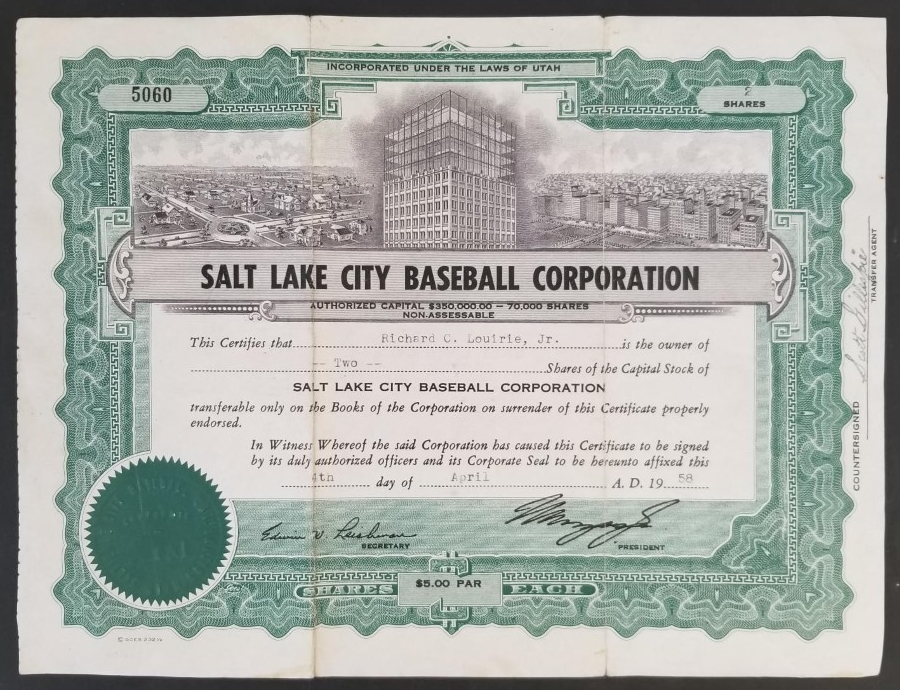 1958 -- Salt Lake City Baseball Corporation Shares Certificate quantity