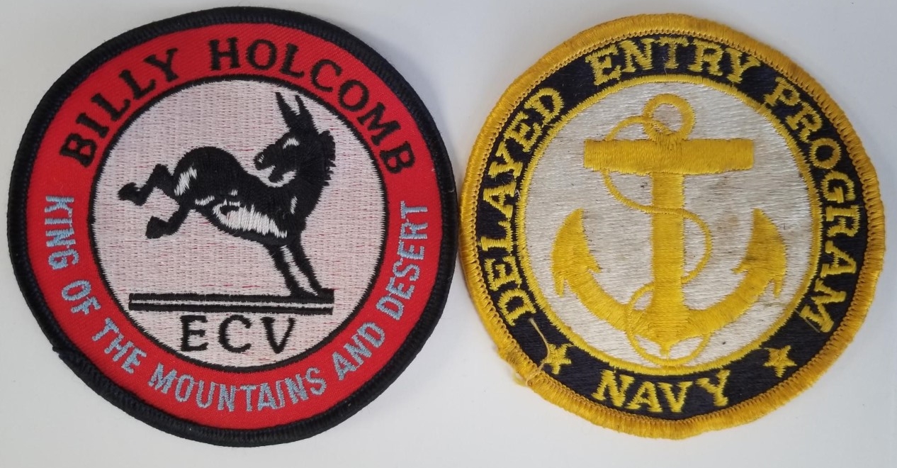 / 2 Cloth Patches — “Delayed Entry Program, Navy” — Billy Holcomb “King of the Mountains and Desert” ECV