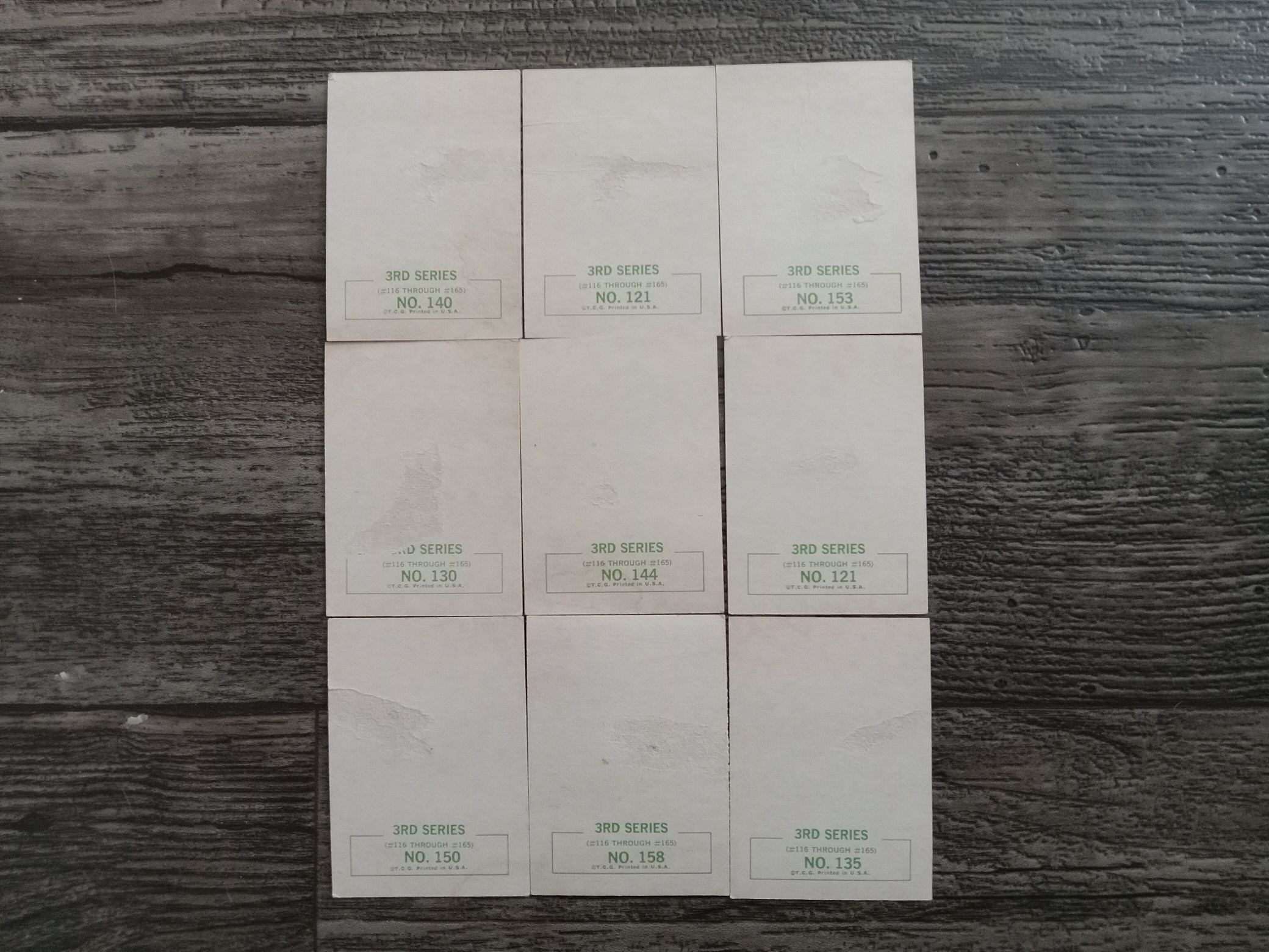 9 fair condition cards. The cards have some minor scuffing, creased, corners, or patches of tearing on the back where something was removed.