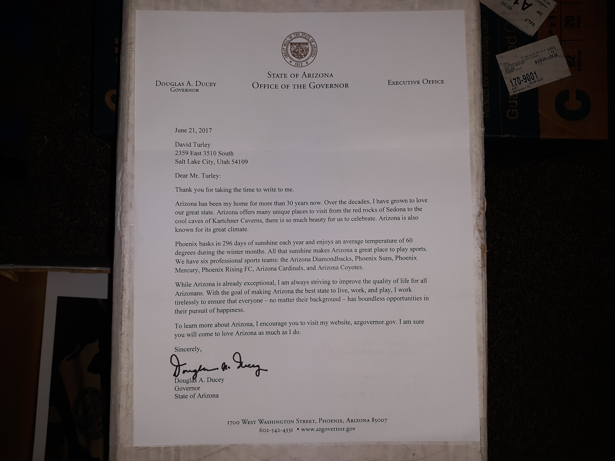 A Letter from and Signed by Governor Douglas A. Ducey