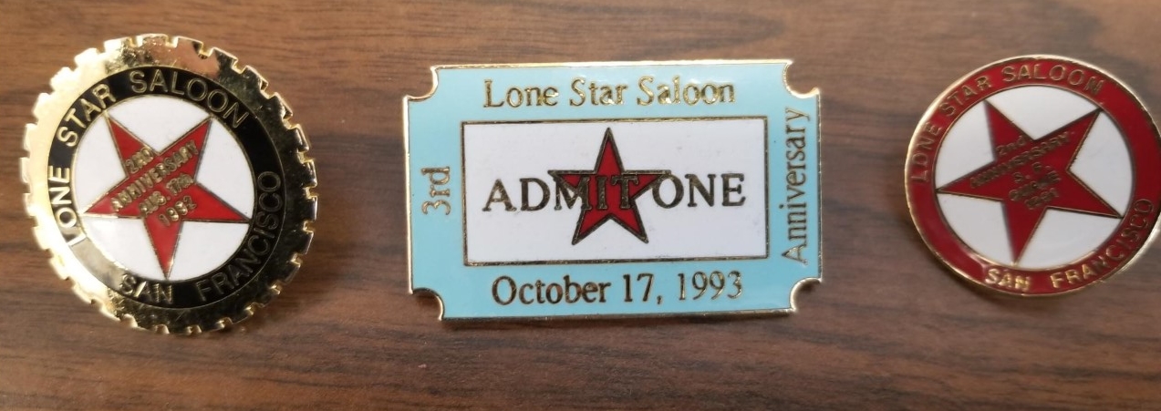 Lone Star Saloon — San Francisco, California — 3 Pins — [Lone Star Saloon 3rd Anniversary ADMIT ONE October 17, 1993 / 2nd Anniversary 1992 Pin / 2nd Anniversary San Francisco Quake, 1991 Pin