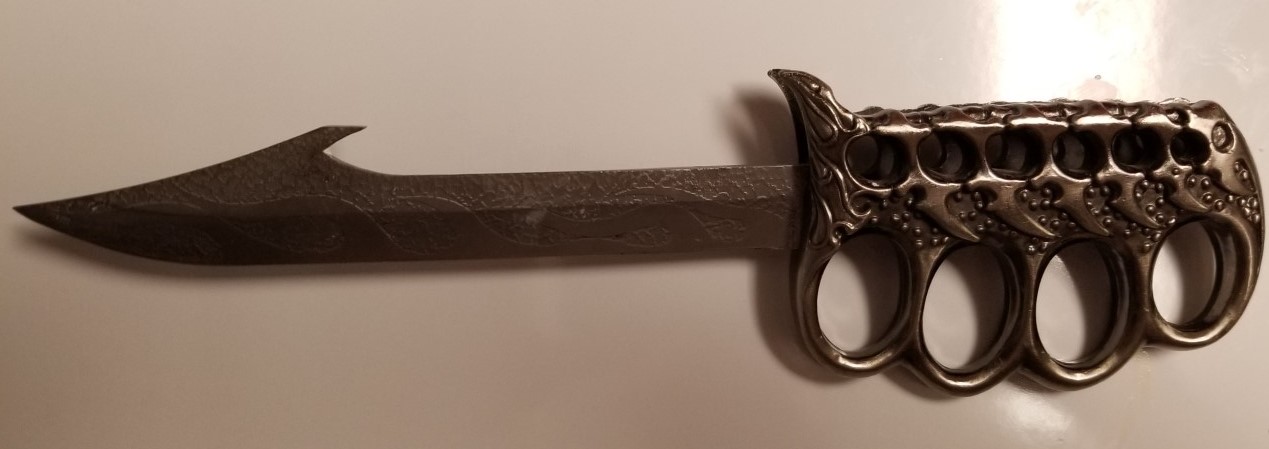 About a foot long, it has knuckle grips. Looks like something might be missing across the top of the handle, but still a cool knife!