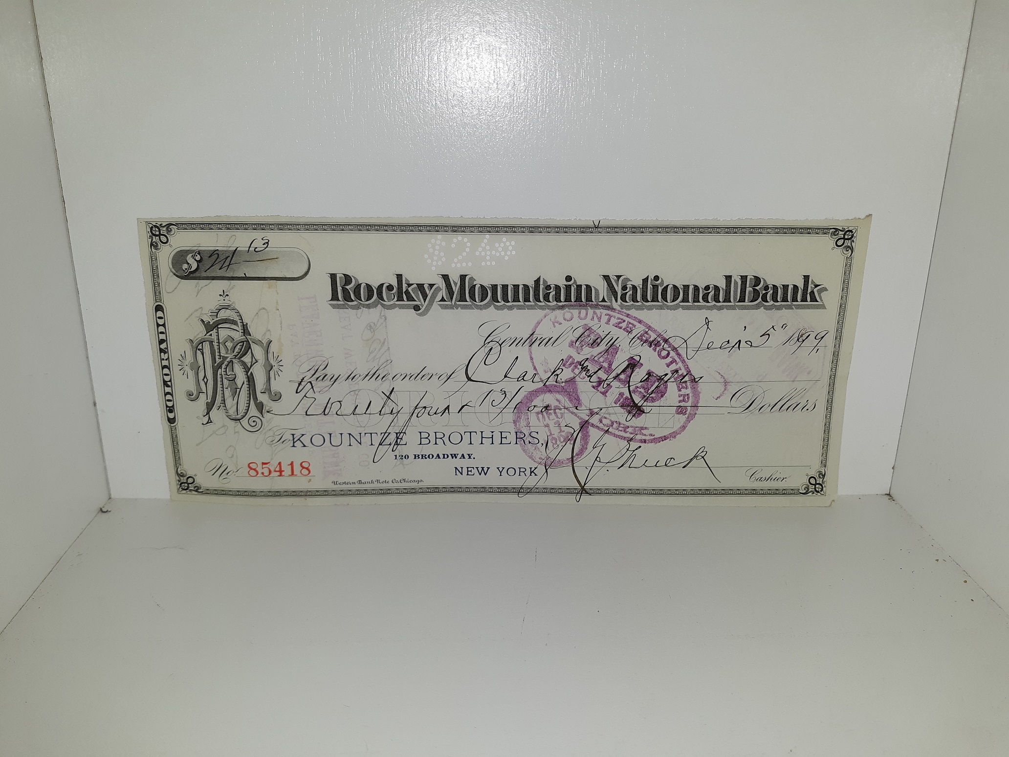 Used Rocky Mountain National Bank Check from 1899 for $34.10