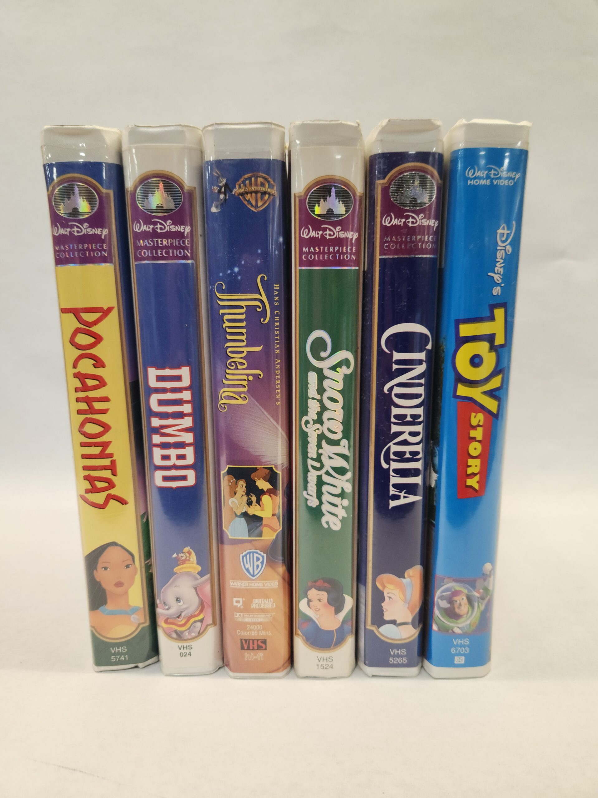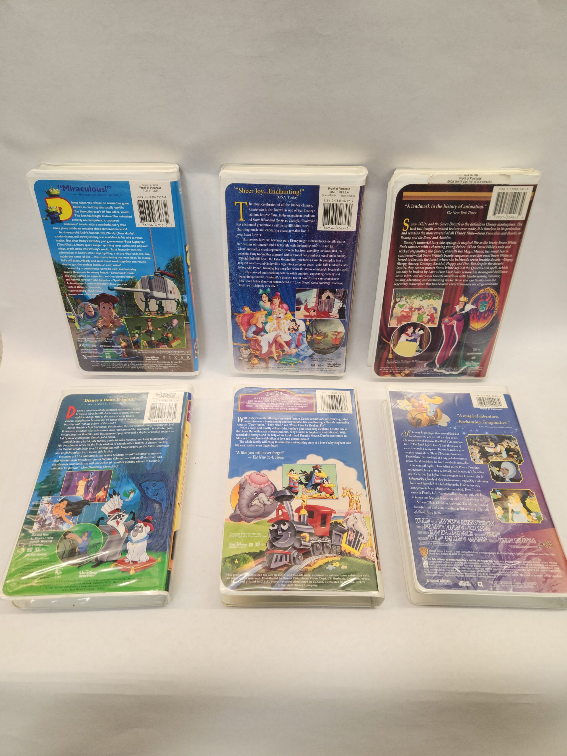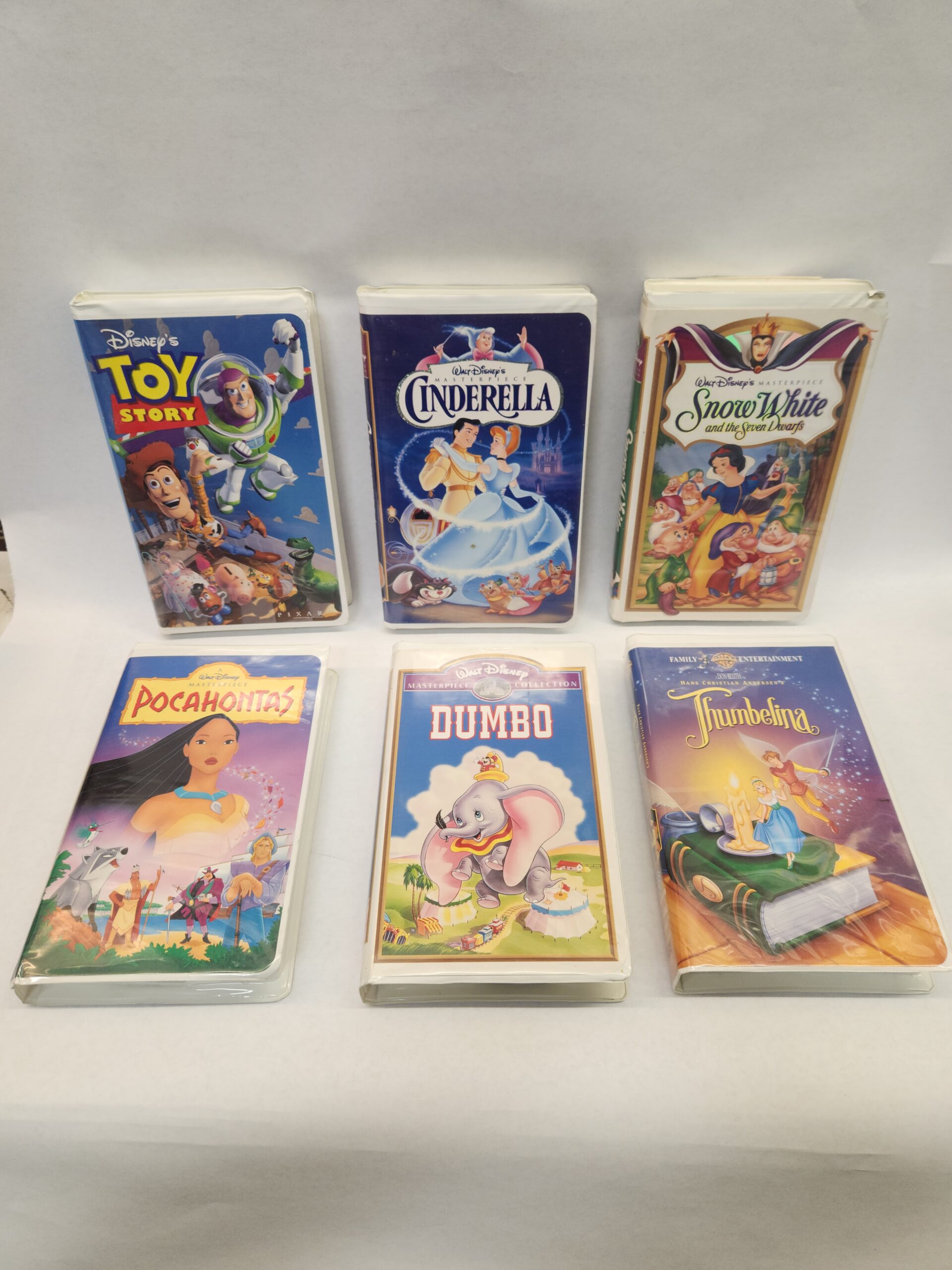 6 VHS Bundle:: Pocahontas, Dumbo, Thumbelina, Snow White and the Seven Dwarfs, Cinderella, Toy Story (Hard Plastic Covers) The cases all show some wear with light scratch marks, slight wear to corners/edges, and dents. The Snow White and the Seven Dwarfs case has a tear on front cover upper right corner. Snow White, Pocahontas, and Dumbo have a Disney Home Video sticker on the bottom edges.
