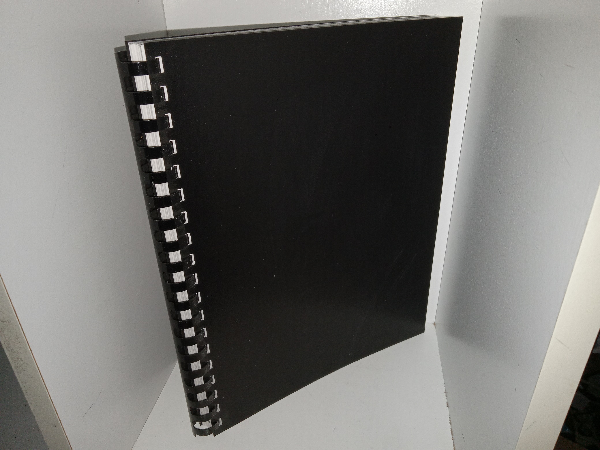 Good condition, large softcover with a black comb binding, and with no title on the cover.  The cover has some scuff marks.  The first page has writing in pencil, and eraser marks.  Text throughout is clean, clear, and legible.