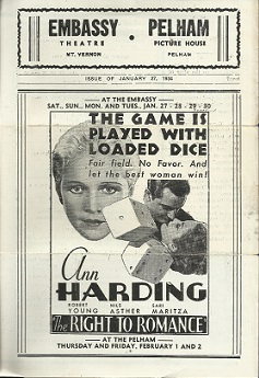 1934 Playbill: The Right to Romance at the Pelham ~ Embassy Theatre