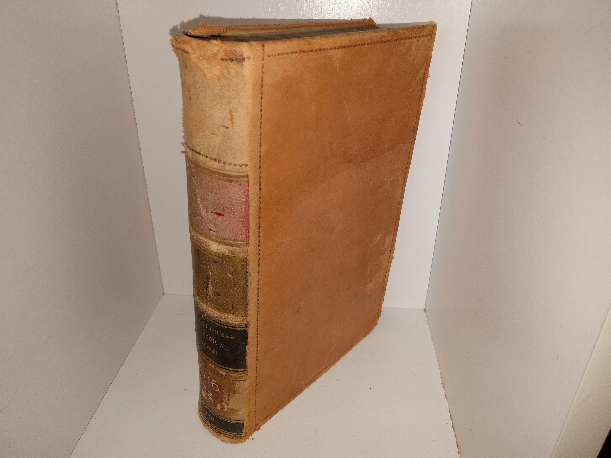 Fair condition, tan, suede leather-bound book. The cover has pieces torn off, fraying, tears, scuffing, fading, scratches, peeling, and ex-library markings written on the spine in white ink. Some pages have stains, tears, creases or wrinkling. The front inside cover has a large, ex-library sticker, writing in pen and pencil, and eraser marks. The front flyleaf has writing in pencil and eraser marks. The internal binding is torn and loose. The back inside cover and back flyleaf may have an ex-library catalog card pouch, or an ex-library sticker.