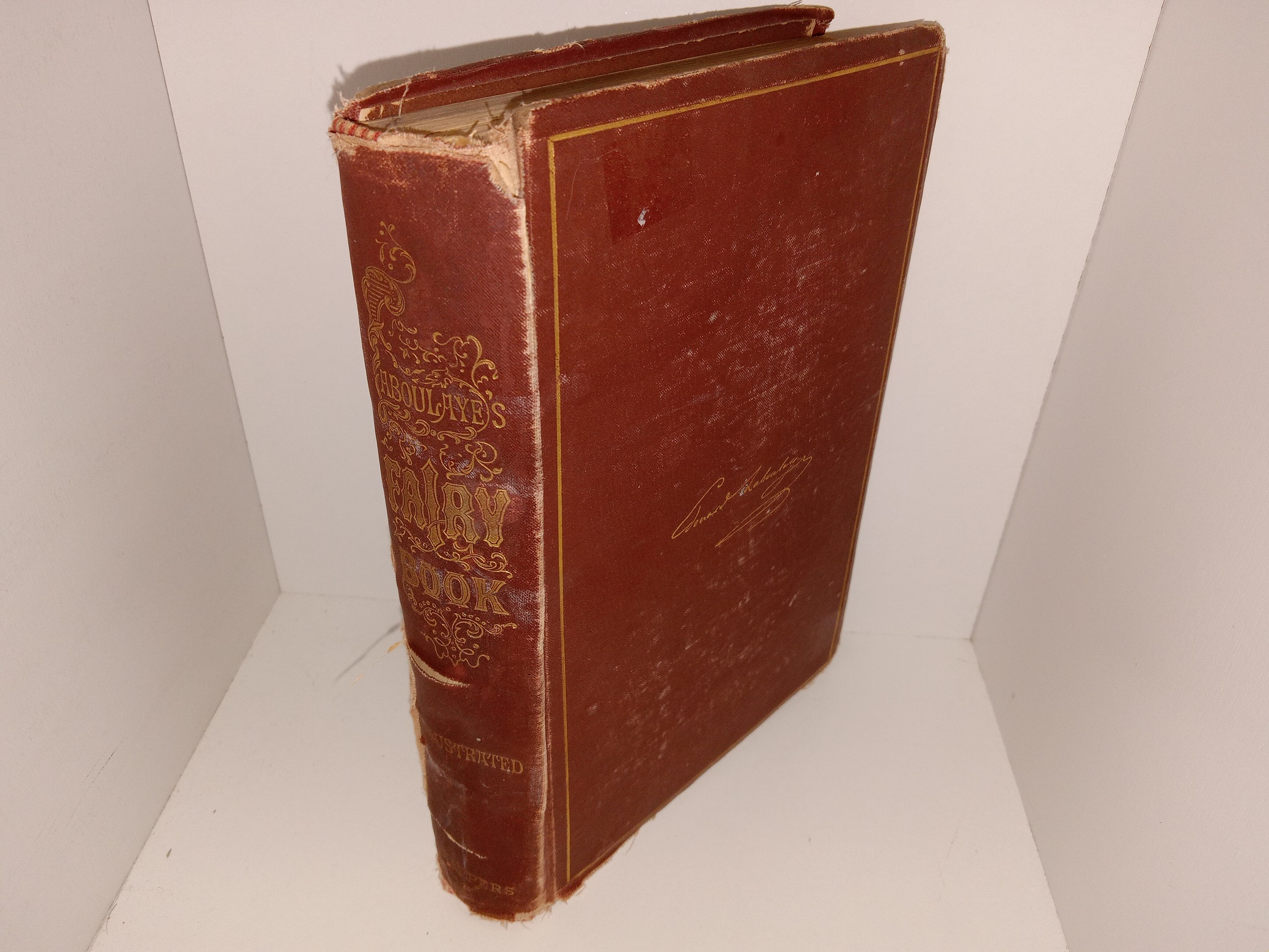 Fair condition, brown hardcover with no dust jacket. The binding is crooked. The cover has heavy scuffing, fading, some bubbling, tears, some pieces torn off, fraying, and bent corners. The internal binding is torn. The inside covers and flyleaves have wrinkles and creases. The pages throughout have stains. The front inside cover has writing in pencil. The second flyleaf has writing in pen, pencil, and eraser marks. Text and illustrations throughout are clear and legible.