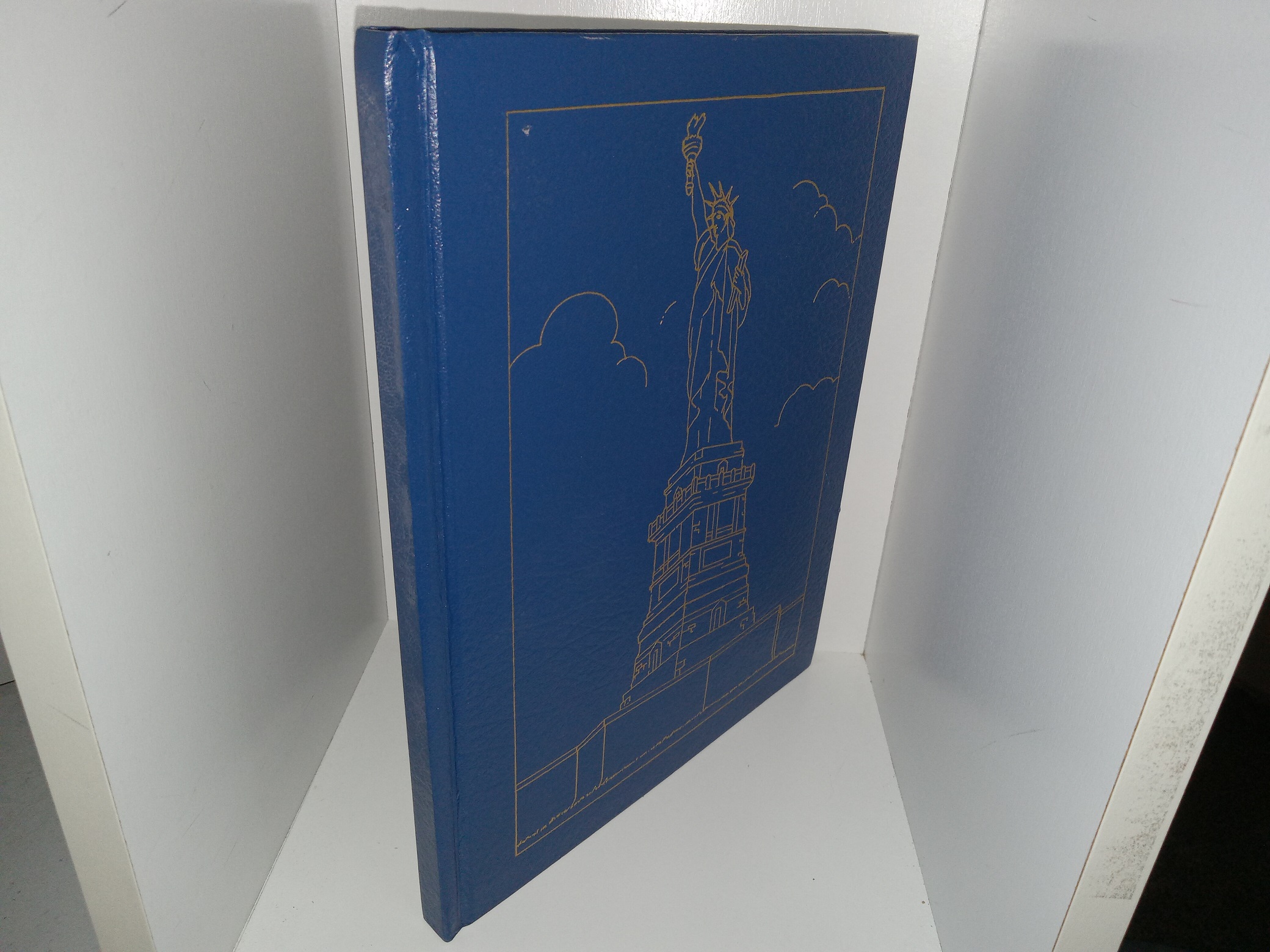 Fair condition, large, thin, blue hardcover with no dust jacket. The cover has scuffing, scratches, some tiny tears, and scuff marks. The front inside cover has a large sticker. The front flyleaf has writing in pencil and eraser marks. Text and illustrations throughout are clean, clear, and legible.