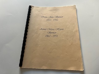 This is a spiral bound family history book. There are some creases to the edges of the book. The text has some highlighter marks. There are some hand written documents in the book. There is a small water drop mark on the front cover.