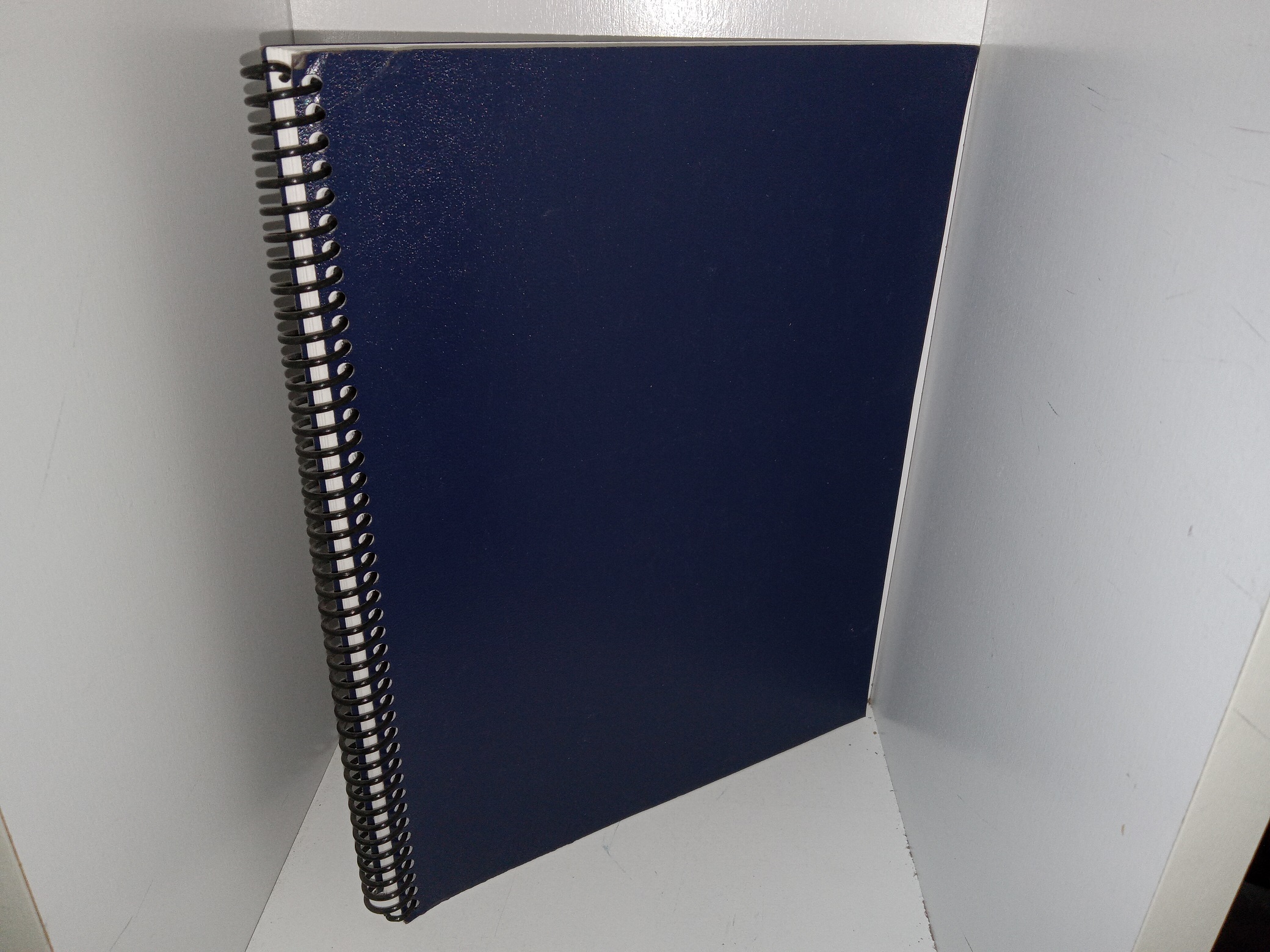 Large, dark blue softcover with a black coil binding. The cover has some wrinkling, tiny tears, and scuffing. The title page has some writing in pencil. Some pages have tiny stains or scuffing on the edges, creased corners, or a tiny stain near the edge. Text and illustrations throughout are clear and legible.