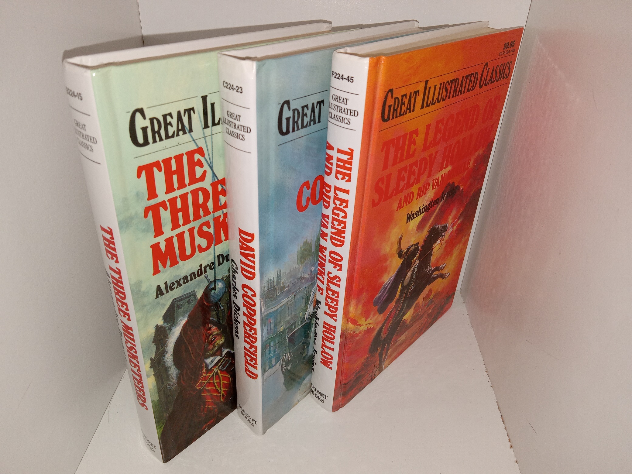 3 fair-good condition hardcovers with white spines and no dust jackets. The covers have some scuffing and adhesive residue. Some of the pages of The Legend of Sleepy Hollow and Rip Van Winkle have tears or pieces torn off, but the text and illustrations throughout are clear and legible, and the front flyleaf has writing in pencil.