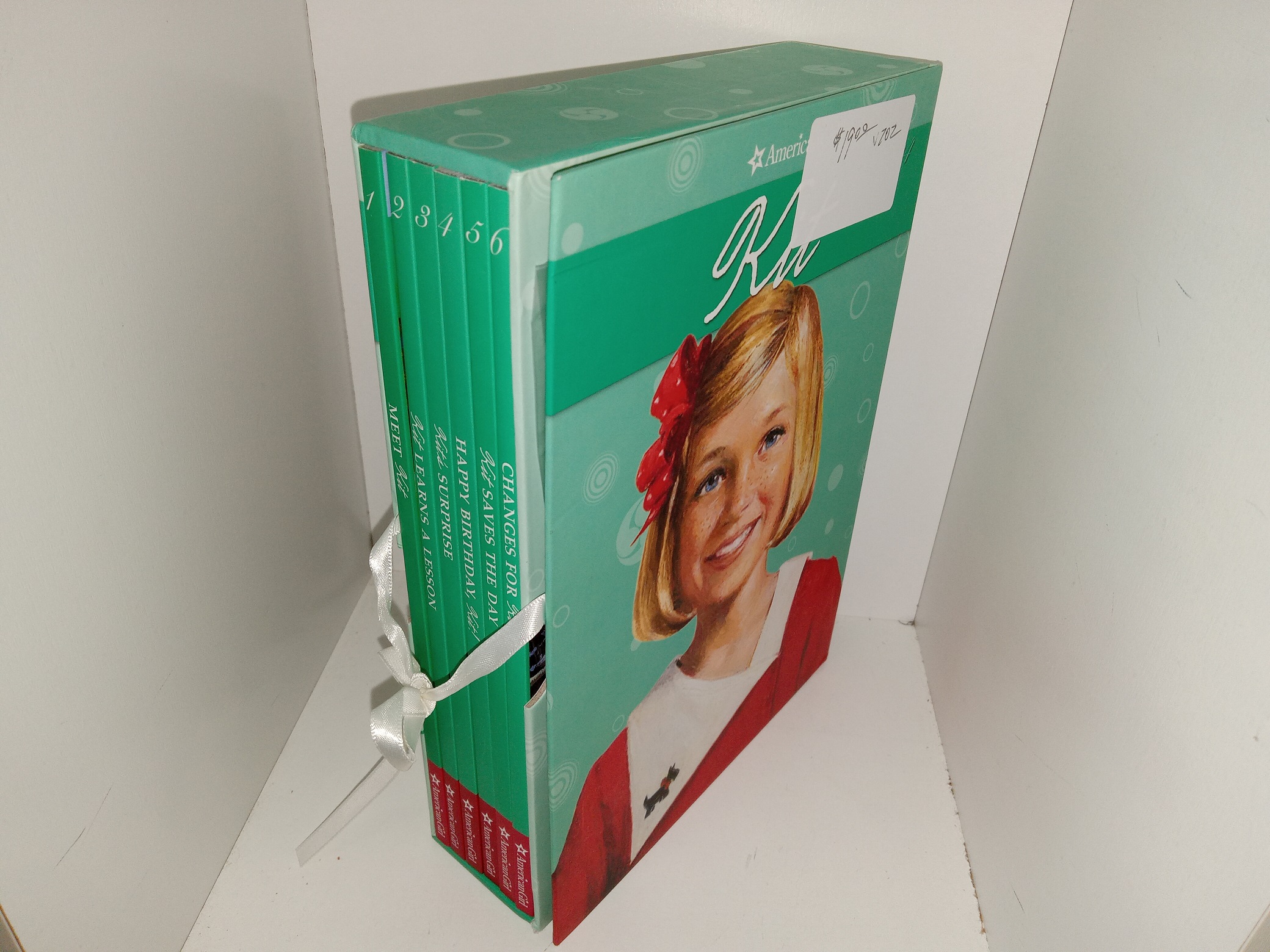Good condition set of 6, thin green softcovers with their original slip-box. The slip-box has a price sticker, scuffing at the corners, and tears where there is a pouch on an inside flap, which tears have been taped over. The books have minor scuffing at the corners and edges. Text and illustrations throughout each book are clean, clear, and legible.