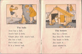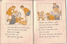 Good condition; cover a bit faded; spine tape loose and worn at the bottom, binding is holding well but part of spine is cracked. There are a few pages that have small tears and a couple with a little staining, but nothing horrible. Slight damage to back wrapper (and that can be seen in one of our scans). Word List in the very back. Cute story with fun illustrations. (See our scans). Overall in good to fair condition for such an old book.
