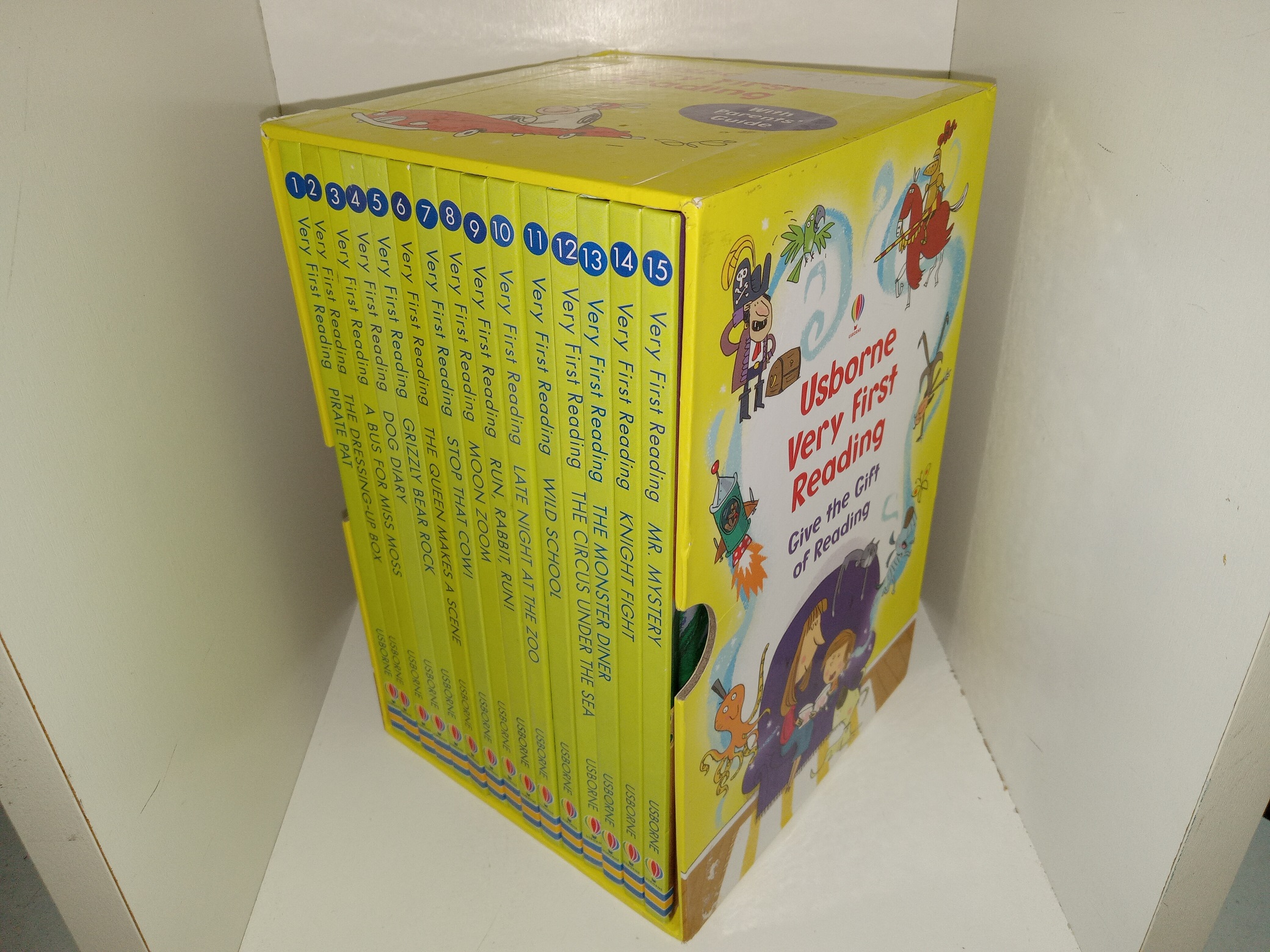 15 good condition, thin, hardcovers kept within their original slip-box. The slip box has some tears, wrinkling, tape, residue, some stains, and a large price sticker. The covers have minor scuffing, and some may have slightly wrinkled corners. Text and illustrations throughout each book are clean, clear, and legible.