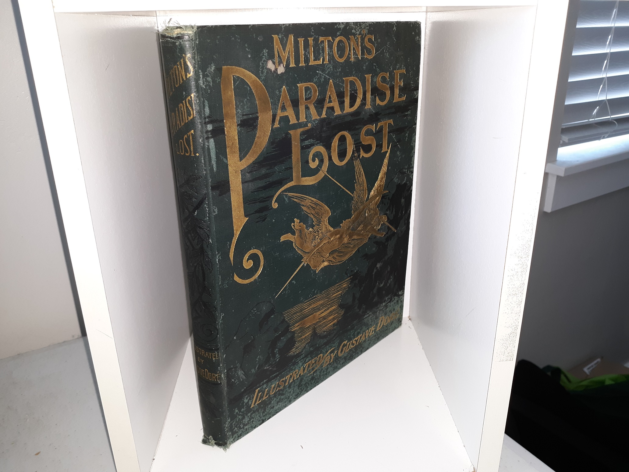 Fair condition, large, green hardcover with no dust jacket. The cover has heavy scuffing, fading, scratches, some stains, bubbling, bent corners, and small tears and fraying at the corners. The internal binding is torn and slightly loose. The inside covers and flyleaves have discoloration, small stains, and wrinkling. The front flyleaf has writing in pencil and eraser marks. Some pages have tears, small pieces torn off the corners or edges, or gray scuff marks, but the text and illustrations throughout are clear and legible.