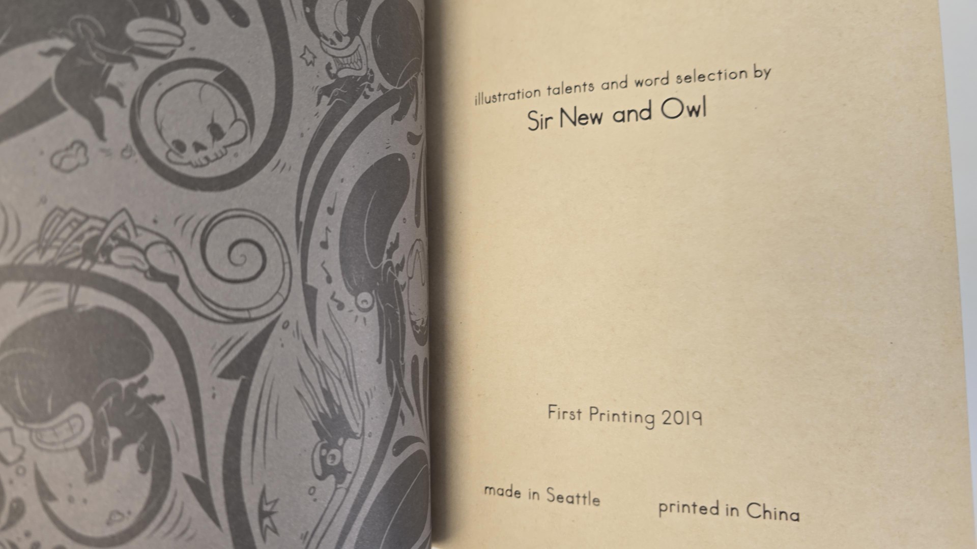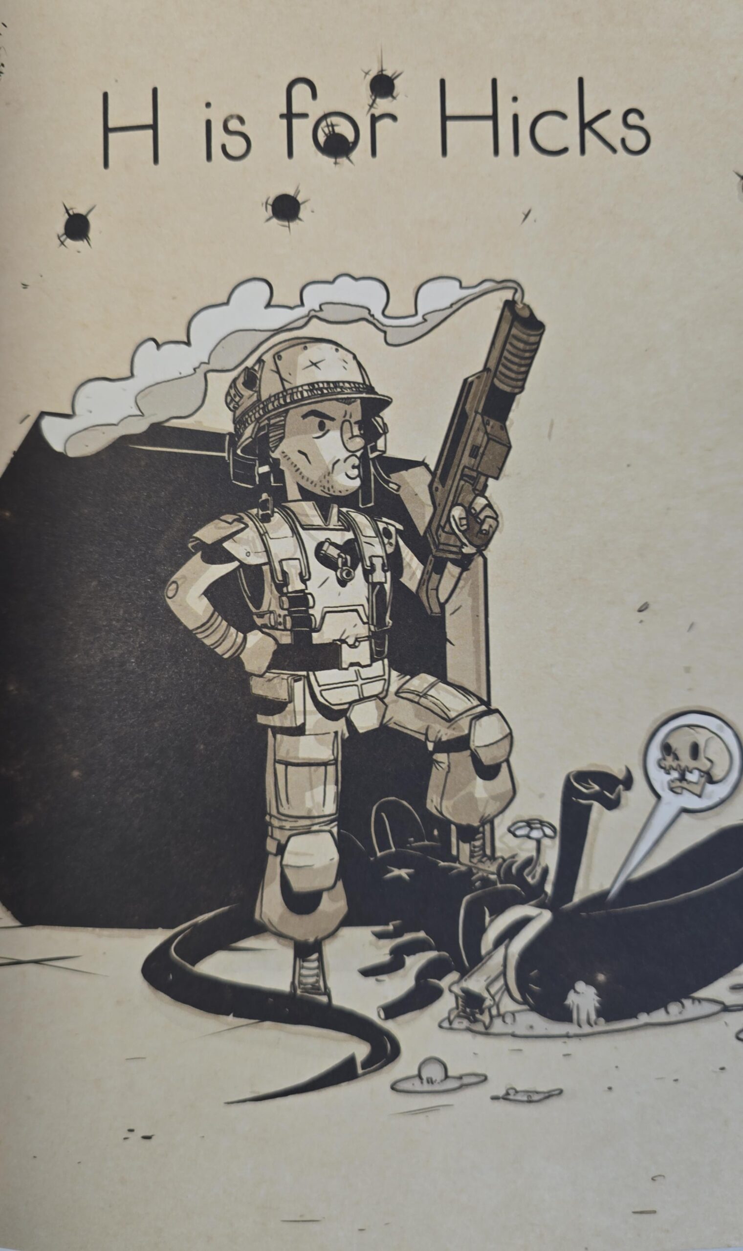 Artwork on the dust cover and throughout. Book is basically in like new condition. Made in Seattle but printed in China, illustrations and word selection by Sir New and Owl, all the artwork revolves around the movies Alien and Aliens, starring Sigourney Weaver.