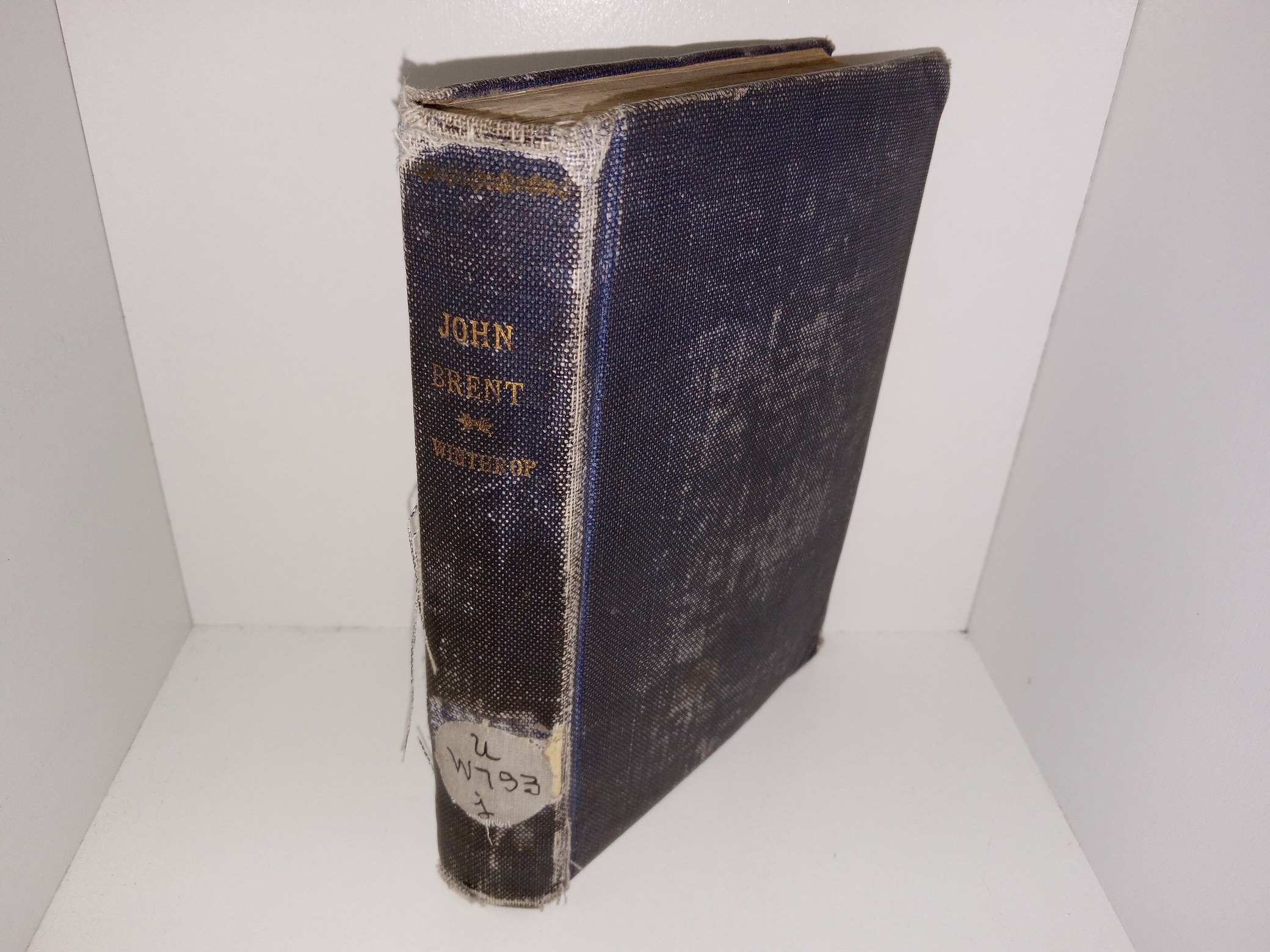 Fair condition, dark blue, ex-library hardcover with no dust jacket. The cover has a crooked binding. The cover has stains, scuffing, fading, tears, fraying, crushed corners, and an ex-library sticker on the spine. The internal binding is torn. The front inside cover has a large, ex-library sticker. The front flyleaf has writing and marks in pen and pencil, and eraser marks. The title page is missing. Some pieces have wrinkling, stains, small pieces torn off, or tears, but the text throughout is clear and legible.