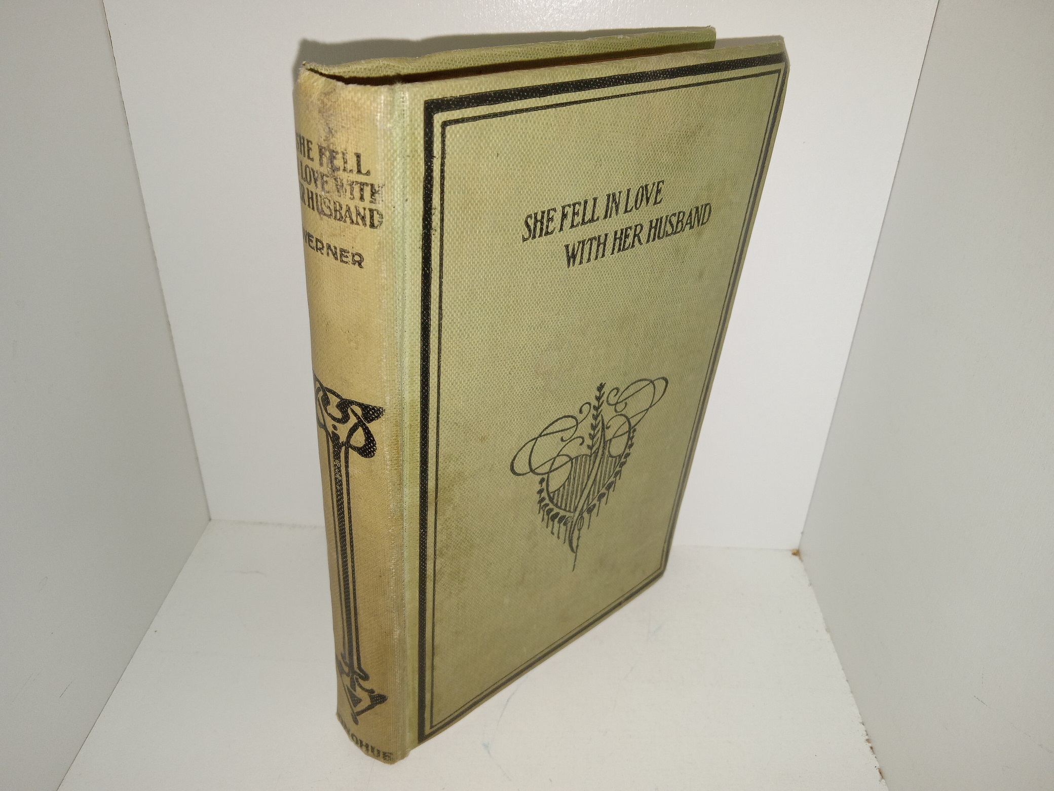 Fair condition, pale green hardcover with no dust jacket. The cover has scuffing, discoloration, stains, some wrinkling, bent corners, and some small tears and fraying at the corners. The internal binding is torn and loose. Some pages have small stains on the edges, but the text throughout is clear and legible. The inside covers and flyleaves have small stains. The front flyleaf has writing in pencil and eraser marks.