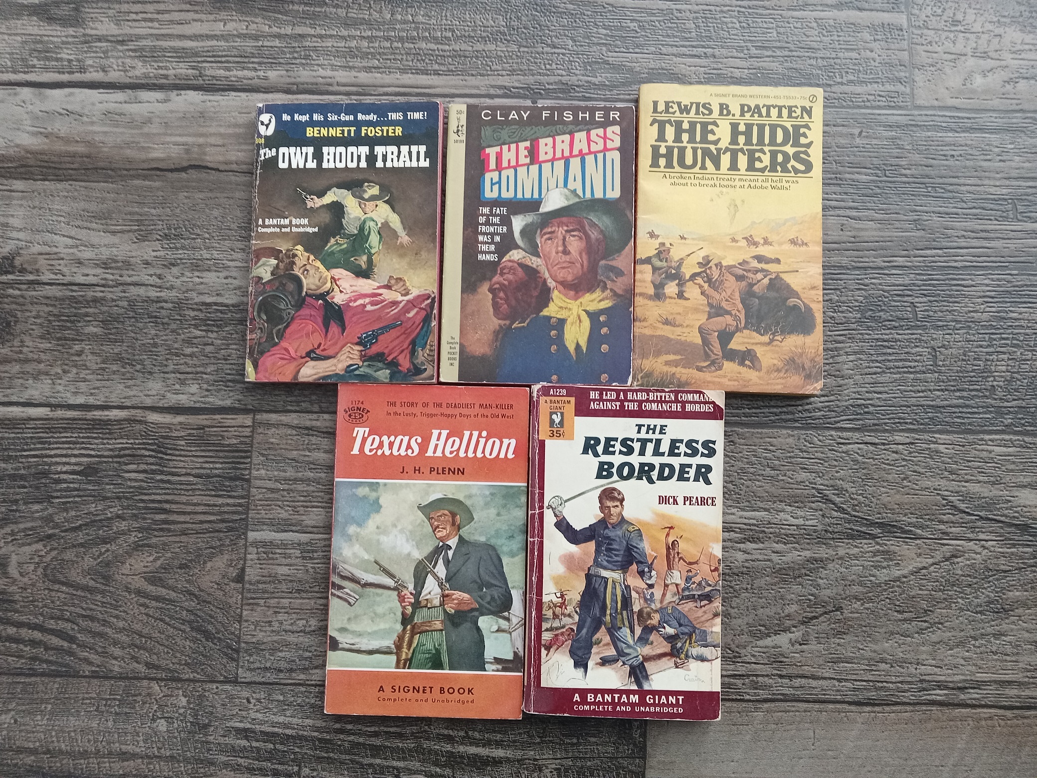 5 fair condition paperback books. The covers have small tears, some pieces torn off, scuffing, stains, old price stickers, and some creasing. Some pages have stains on the edges. Text throughout each is clear and legible.
