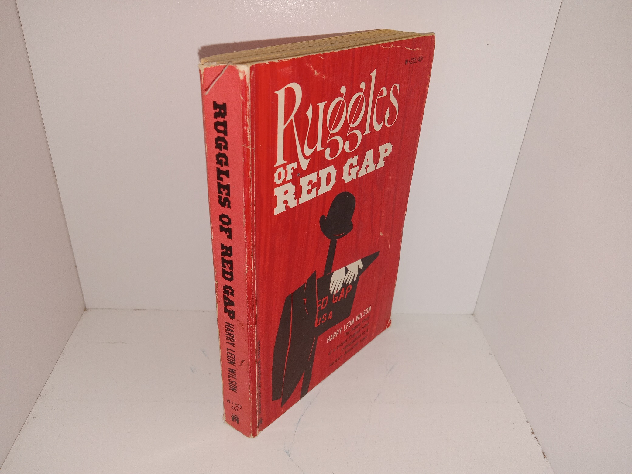 Fair condition, red paperback. The cover has tears, creases, heavy scuffing, graying, and some small pieces torn off. Some pages have creased corners. The first page has writing in pencil, eraser marks, an ink stamp, and a bottom corner torn off. Text throughout is clear and legible.