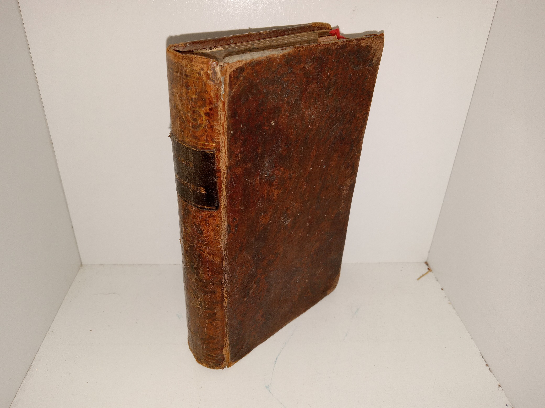 Fair condition, small, brown, leather-bound book. The cover has some stains, scuffing, peeling, some tears (particularly on the edges of the spine), fraying, and some warping. The inside covers and flyleaves have discoloration. The front flyleaf and the second flyleaf are stuck together. Some pages have stains, wrinkling, or small pieces torn out of the centers. The title page has writing in pencil. The back inside cover and back flyleaf have adhesive residue.