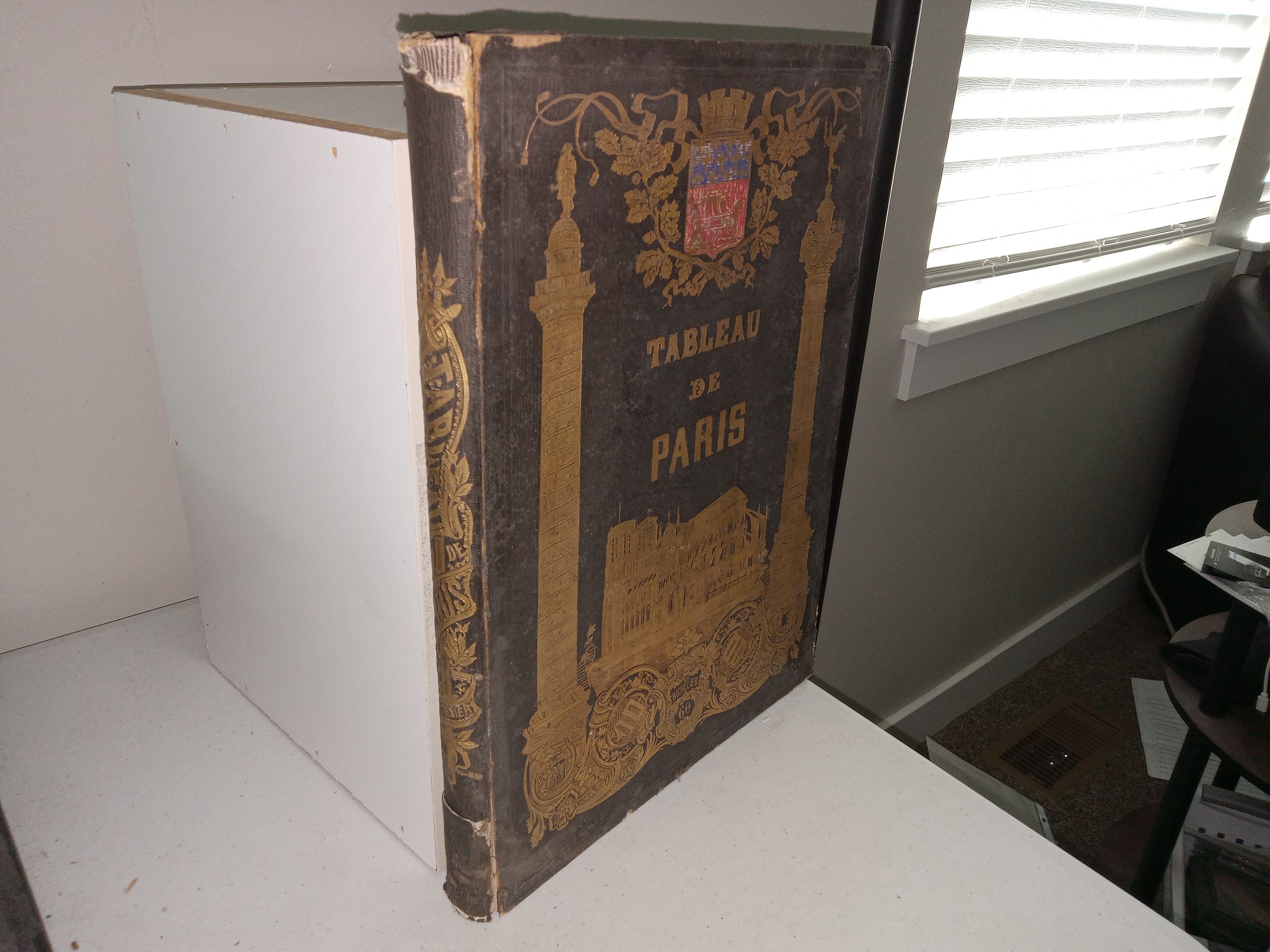 Fair condition, large, black hardcover with no dust jacket. The cover has pieces torn off, tears, scuffing, fading, fraying, and stains. The internal binding is slightly loose. Some pages have stains, or small tears on the edges. The front flyleaf has writing in pencil and eraser marks.
