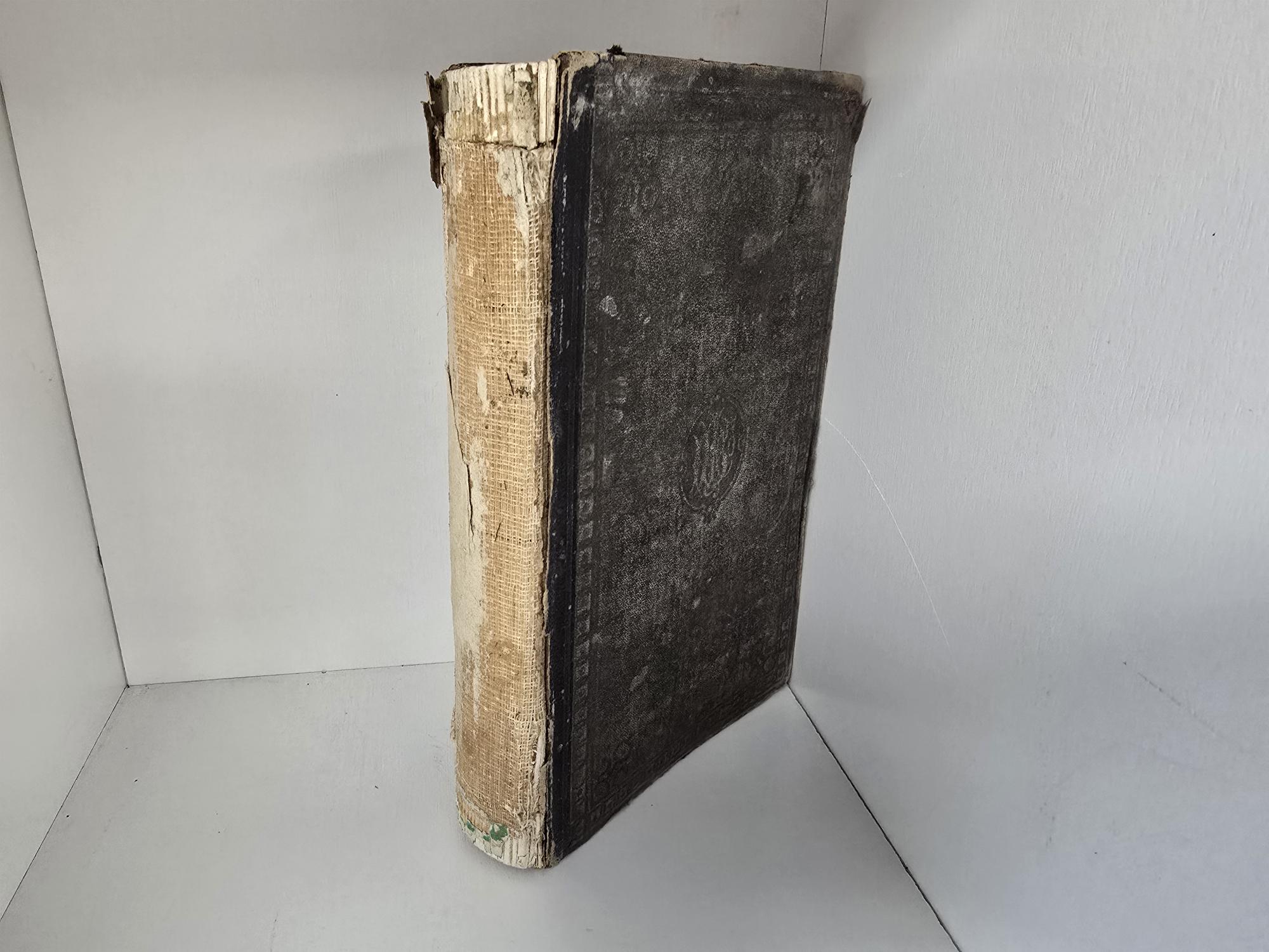 Dark brown hardcover. Front and back covers have tears and small stains, as well as shelf wear. The spine’s cover is missing, but still together. Some pencil markings on flyleaf, however, text throughout is clean, clear, and legible.