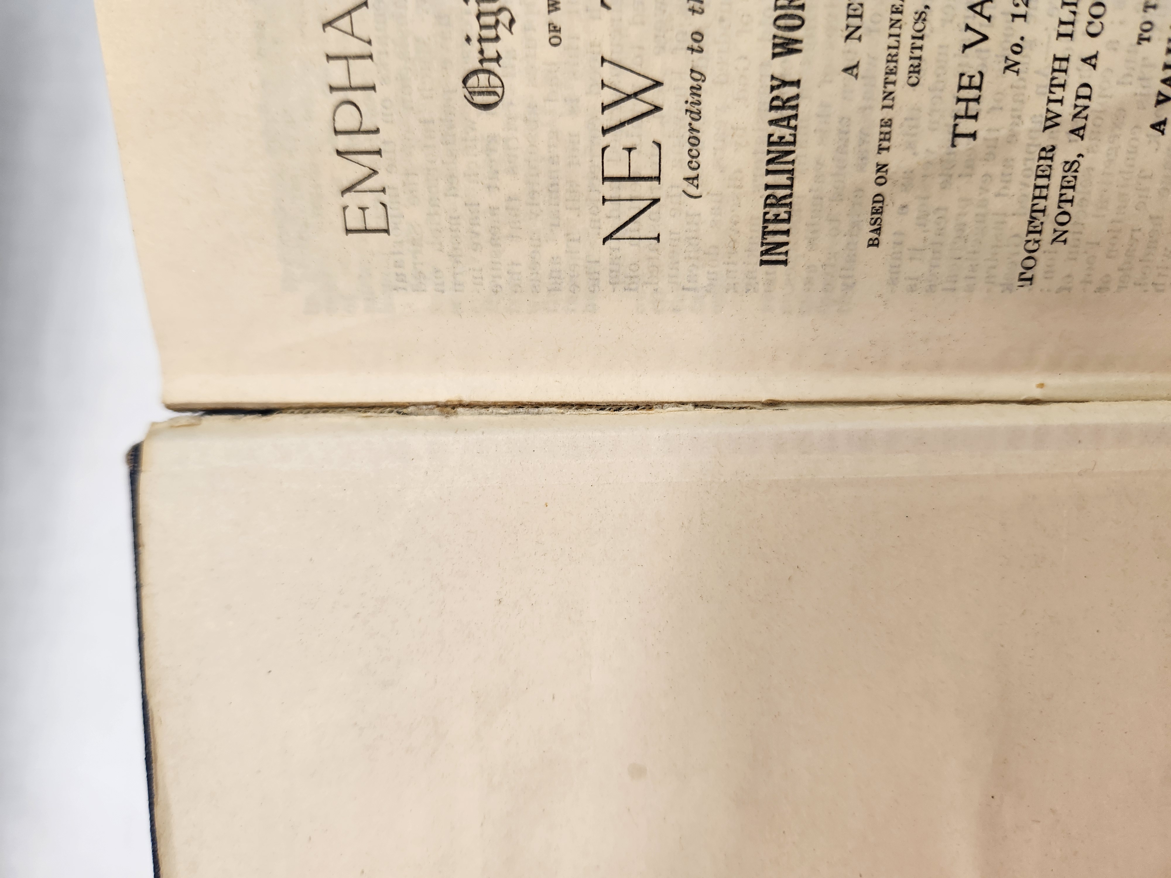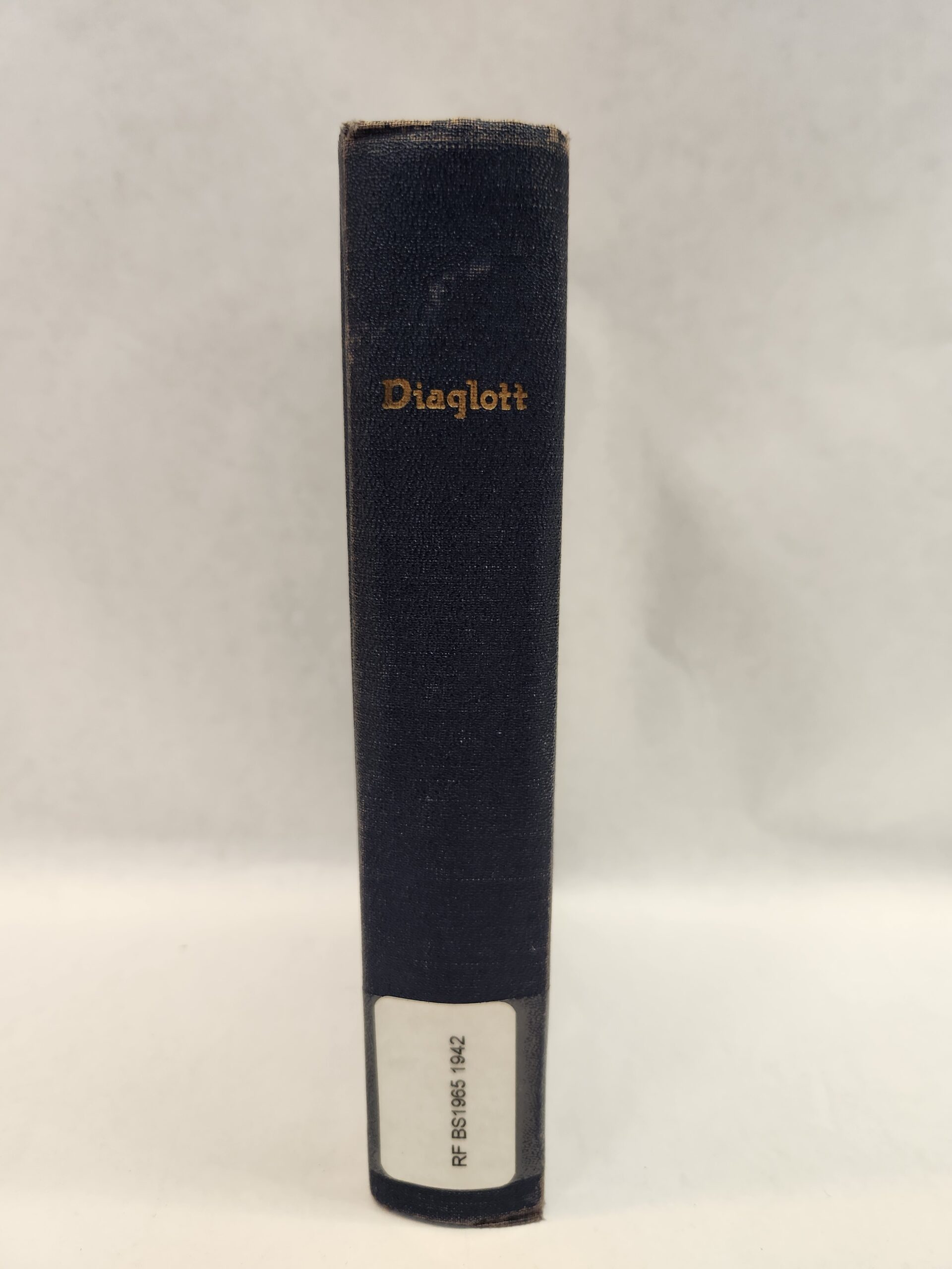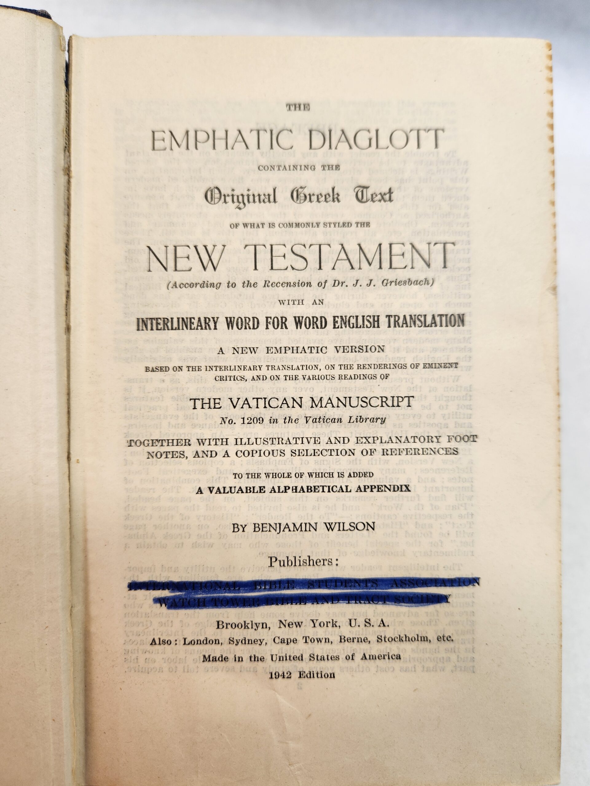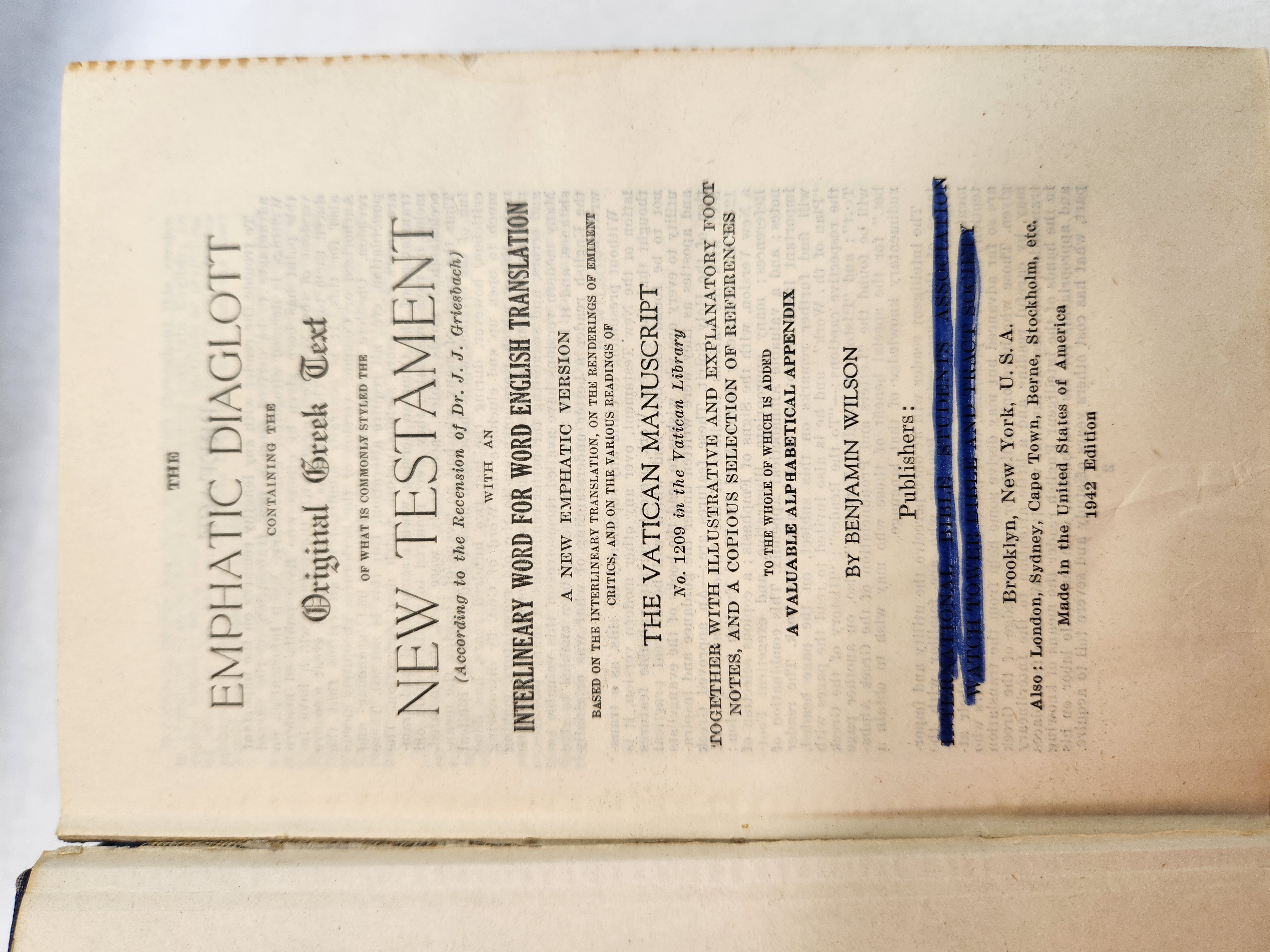 Diaglott (New Testament in Greek, 1942, Hardcover) No marks/writing on pages, except for a dark highlight on title page (see picture in gallery) and name written in pen on the inside of front cover. Pages are starting to come away from cover (see picture). Couple library stickers on the inside of the front cover and on the spine. Corners and edges show some shelf wear with scuff marks and small tears. Last blank page is torn.