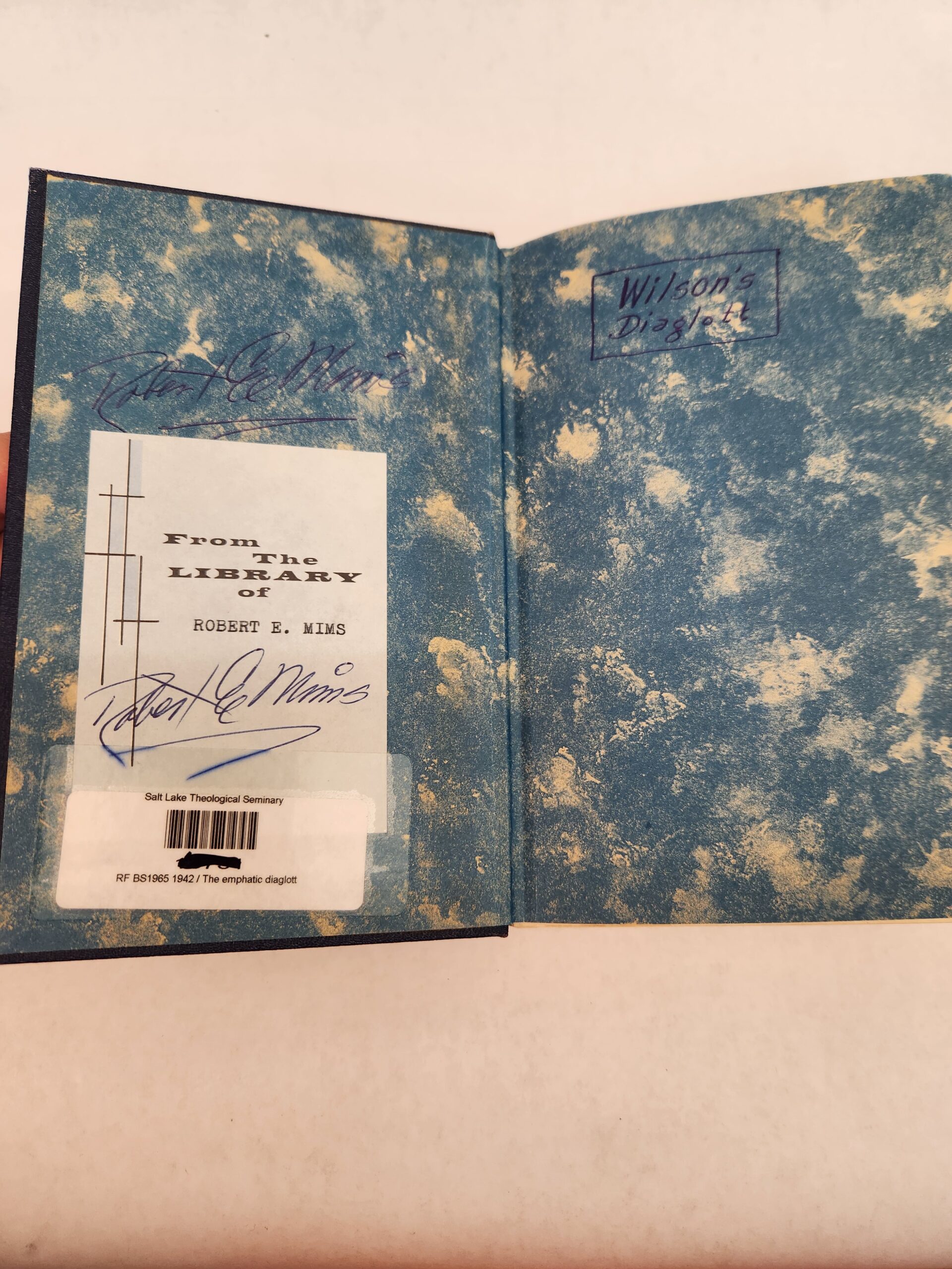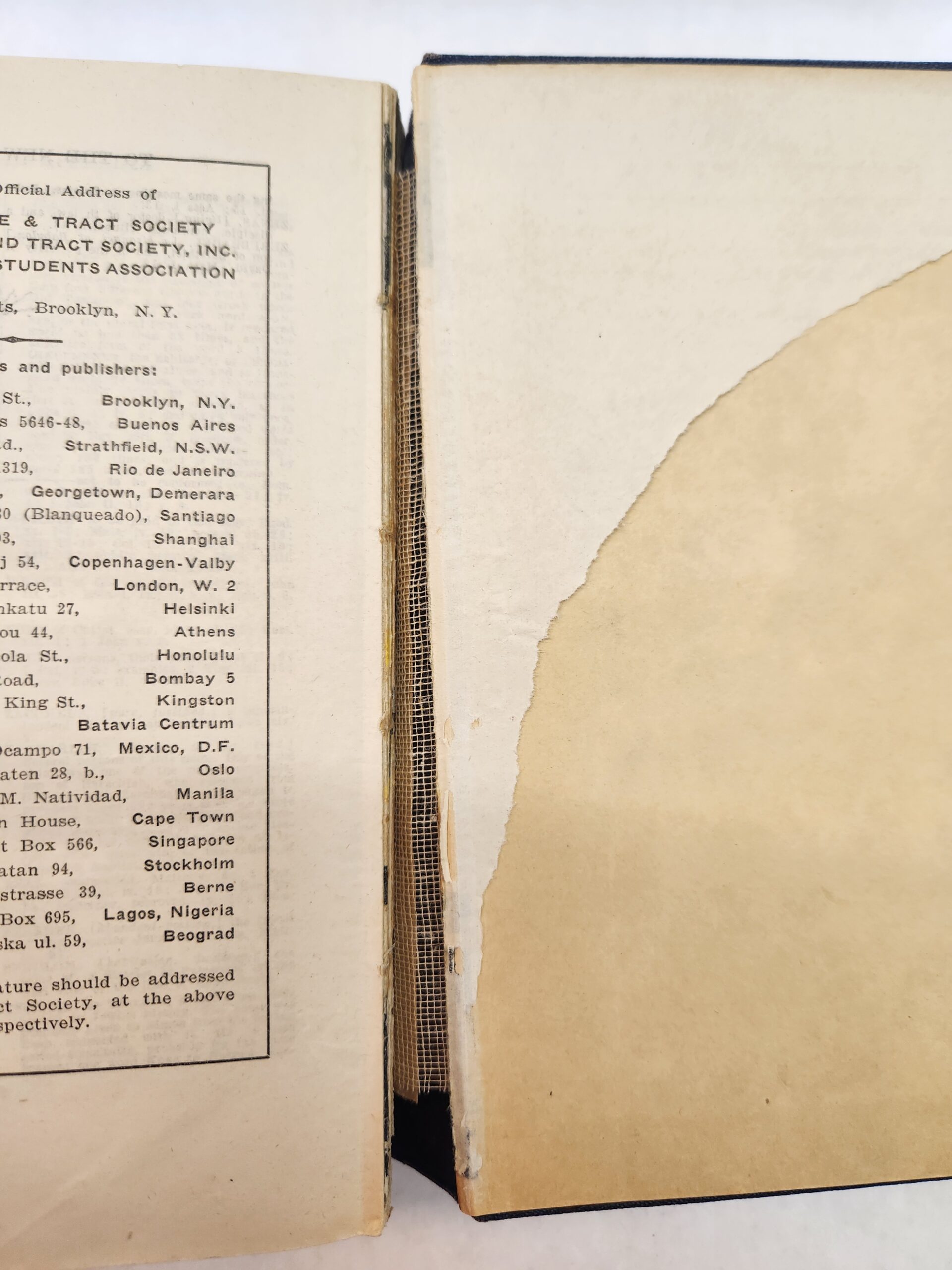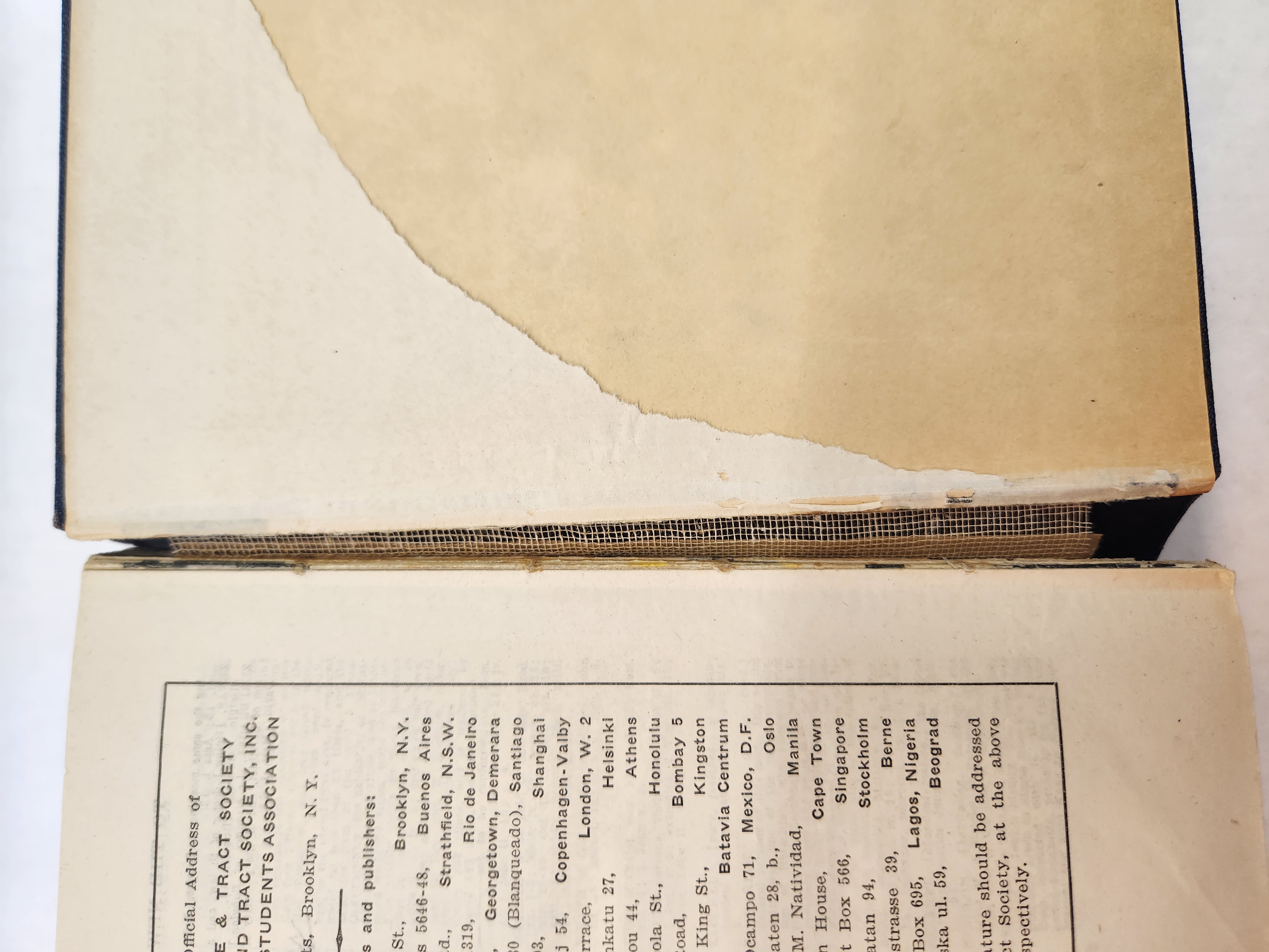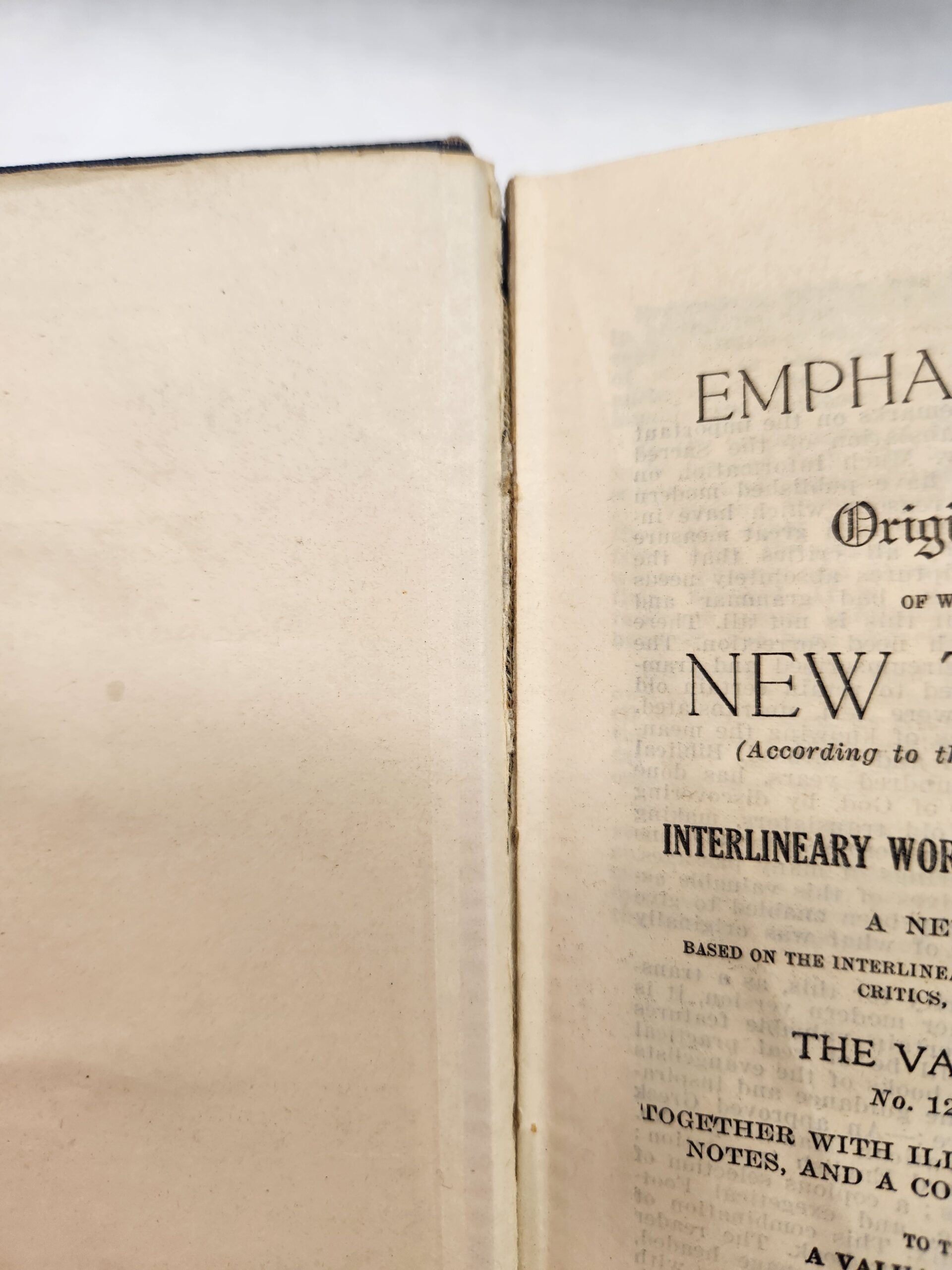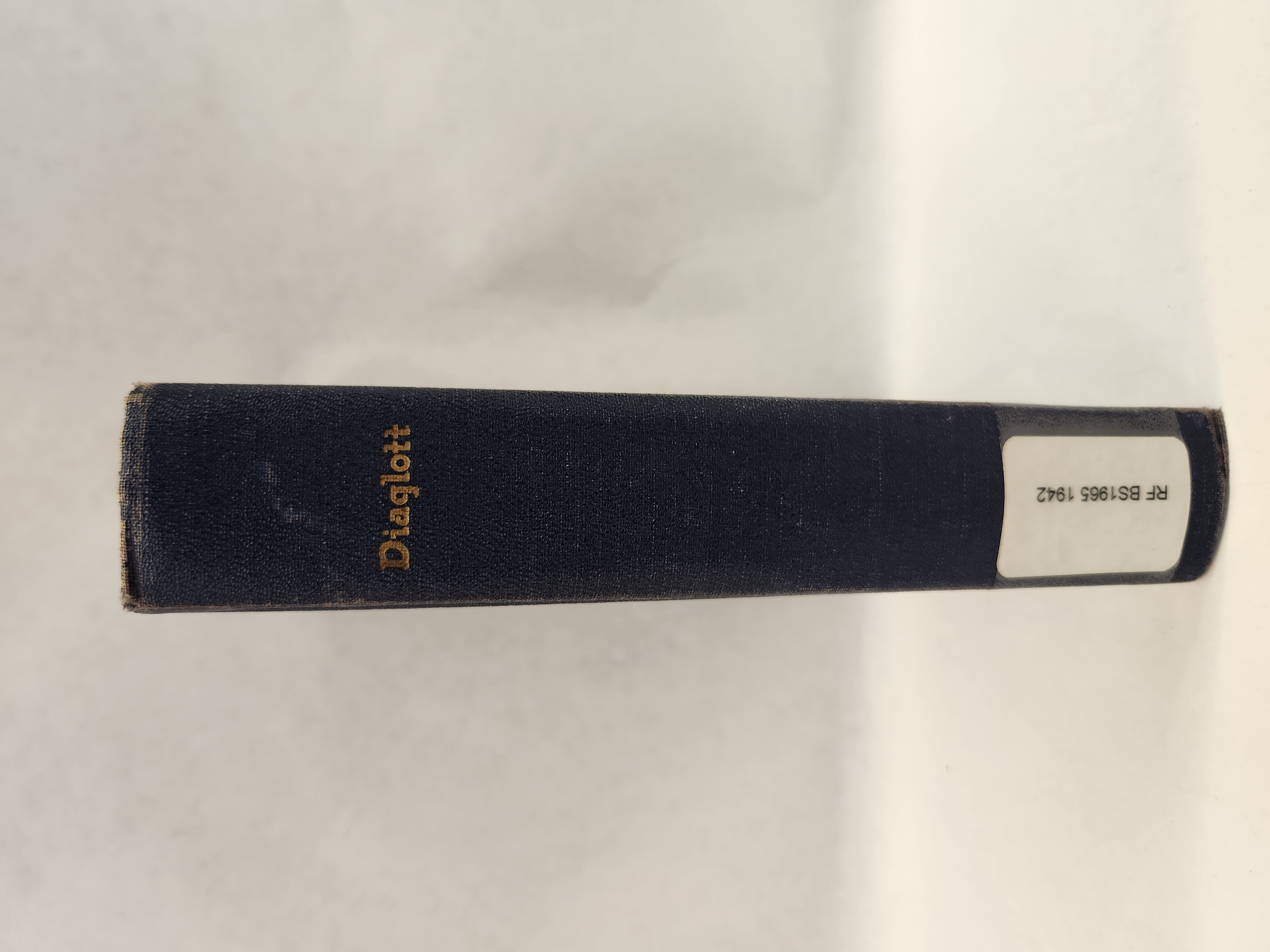 Diaglott (New Testament in Greek, 1942, Hardcover) No marks/writing on pages, except for a dark highlight on title page (see picture in gallery) and name written in pen on the inside of front cover. Pages are starting to come away from cover (see picture). Couple library stickers on the inside of the front cover and on the spine. Corners and edges show some shelf wear with scuff marks and small tears. Last blank page is torn.
