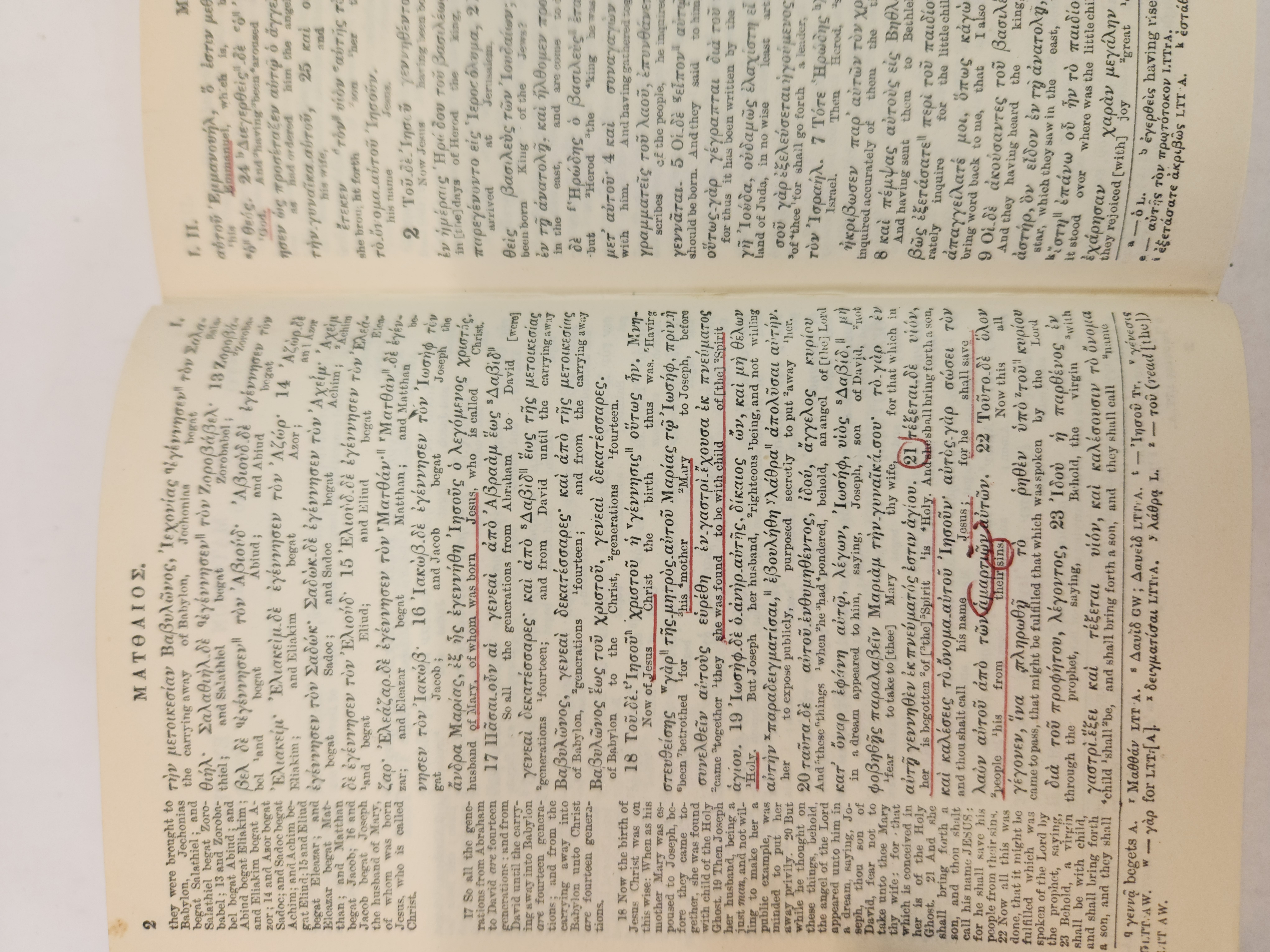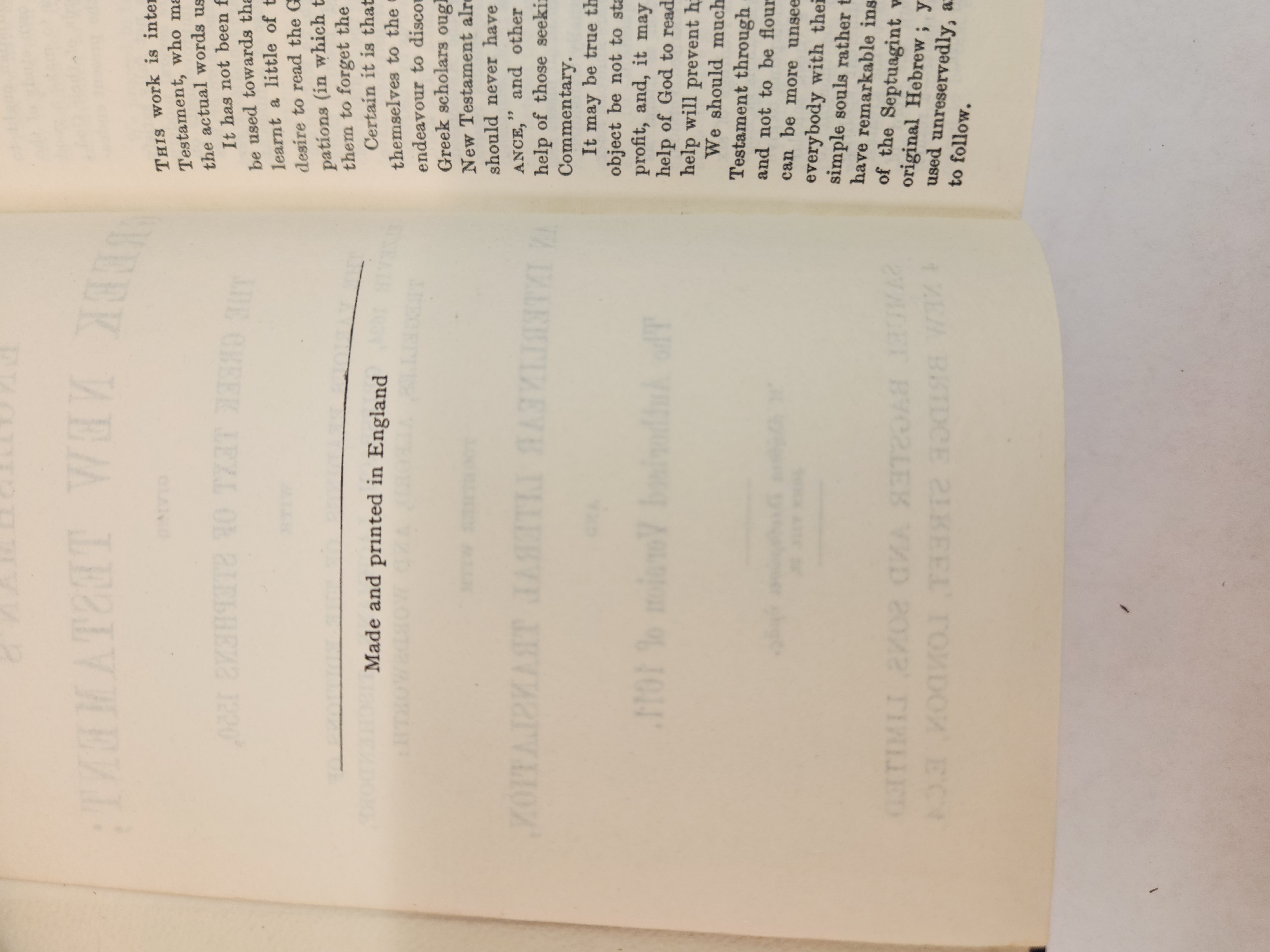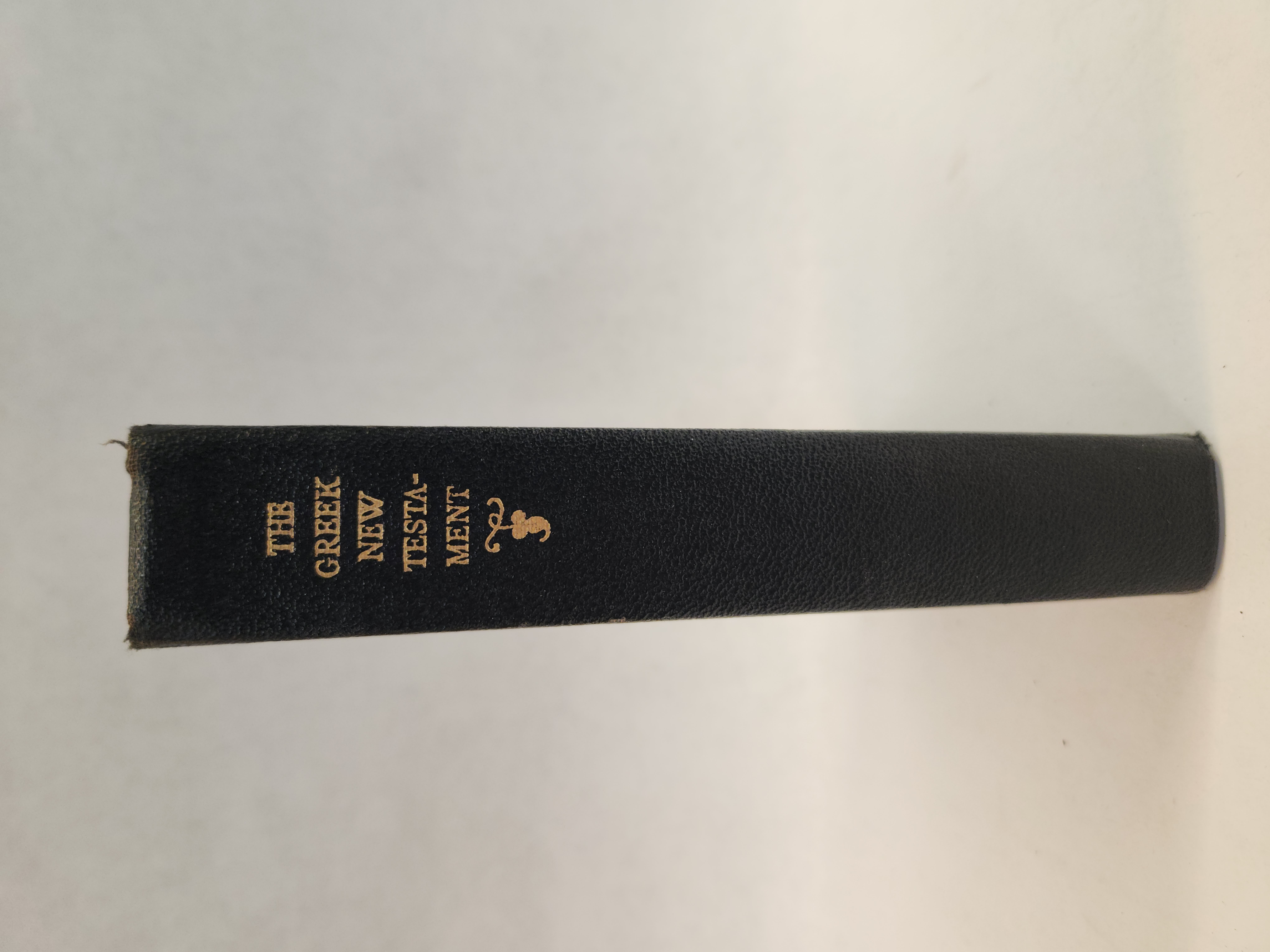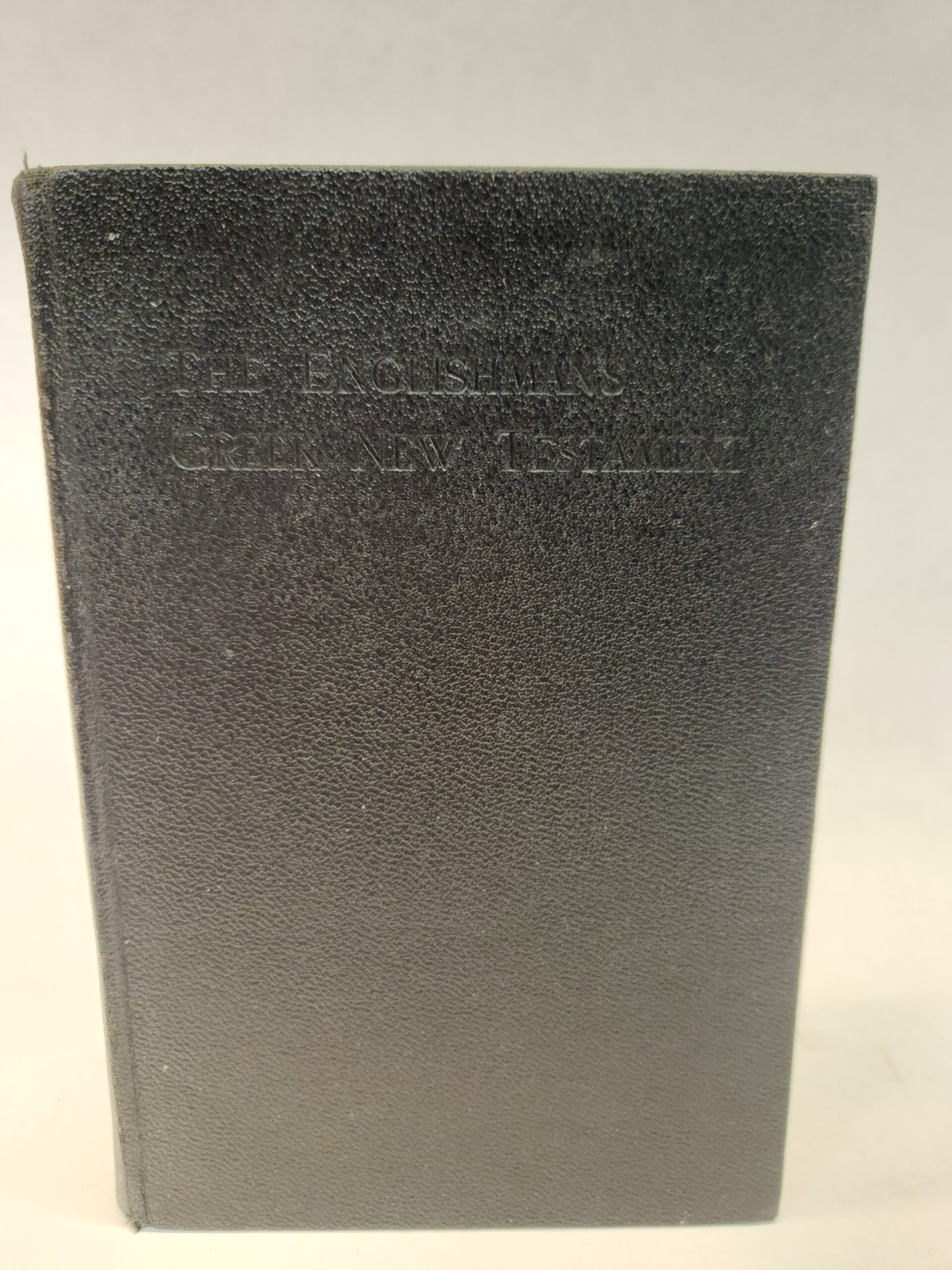 The Englishman’s Greek New Testament (1877, Hardcover) Some red underlining, circling, annotations throughout the book. Name written on the inside of front cover. Corners and edges show some shelf wear with scuff marks. Binding is good. Top of spine is bent in. Some pages have a bent corner (see pic in gallery).