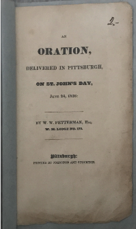 1826 ~ W. W. Fetterman, An Oration Delivered in Pittsburgh on St. John’s Day