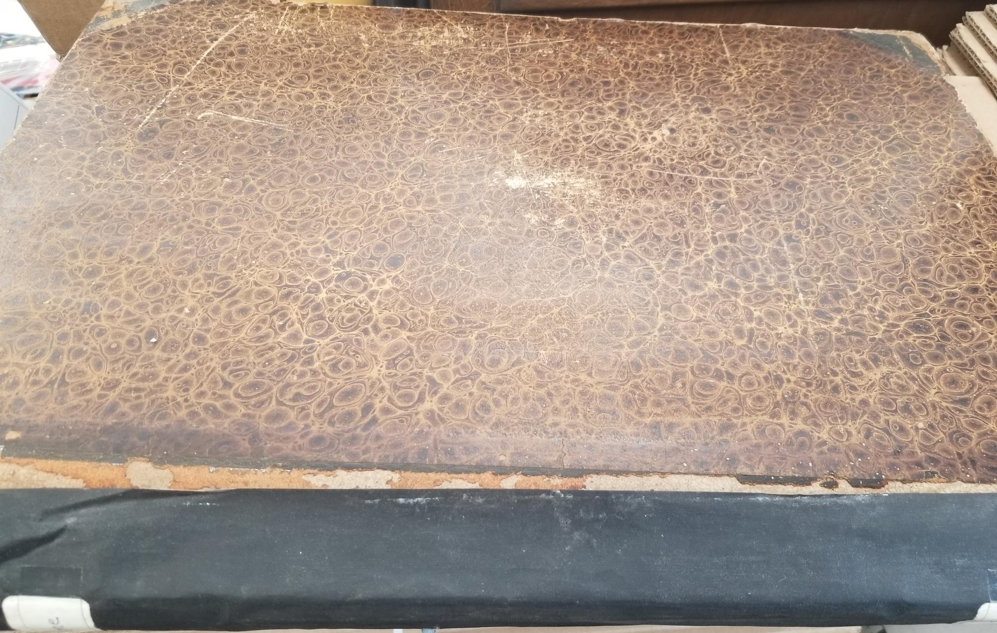 Very large size hardcover; boards are loose; someone put cheap tape and labels on the spine, but they have disconnected; pages are mostly find, but some are a bit chipped.