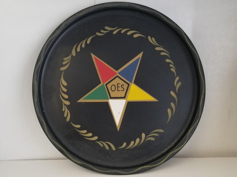 Black metal (maybe tin?) tray with OES in the middle of it; Order of the Eastern Star.