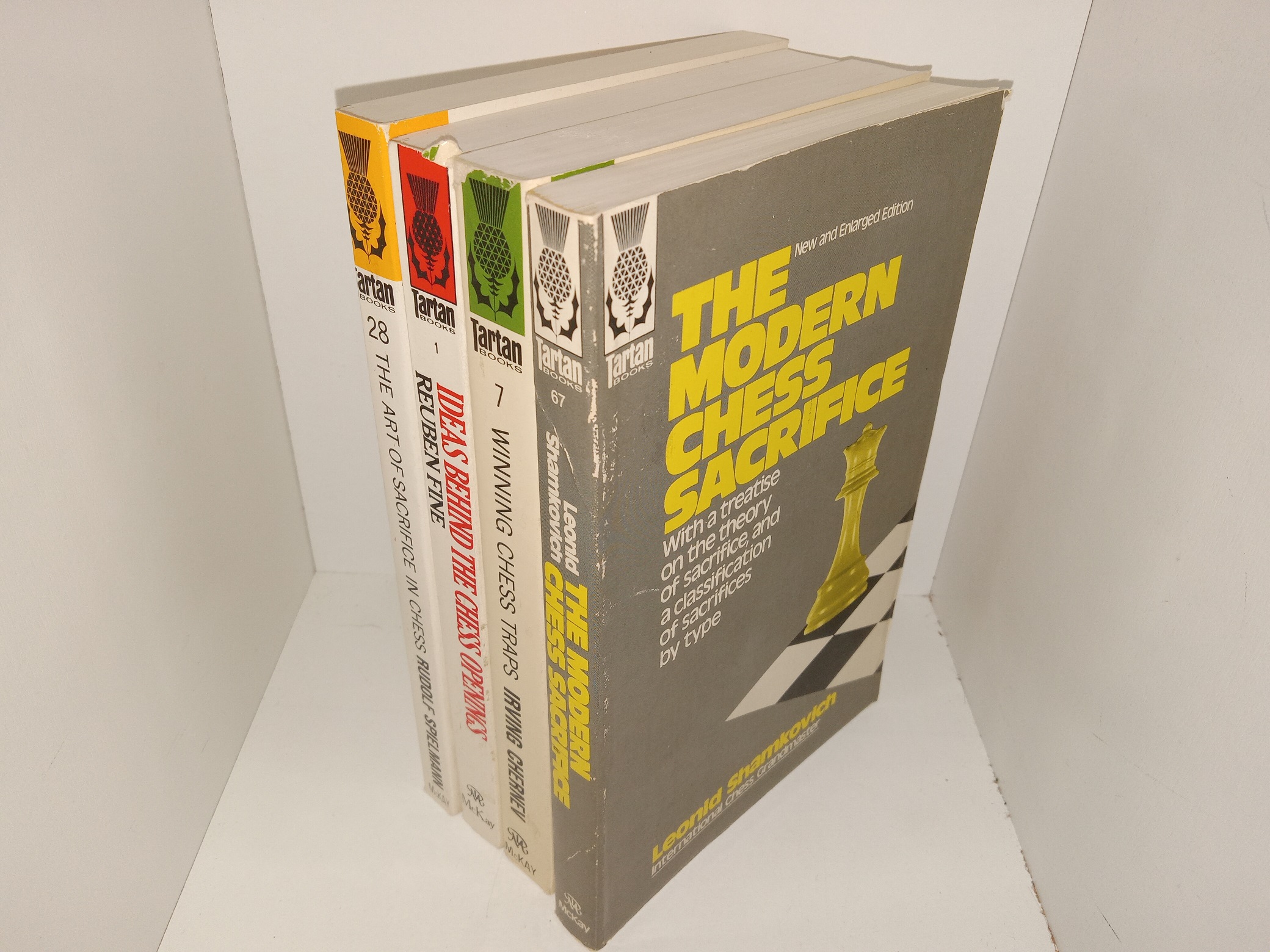 4 fair condition softcovers. The covers have scuffing, some tears, small pieces torn off, creases, and stains. The title page of The Modern Chess Sacrifice has writing in pencil. Text and illustrations throughout are clean, clear, and legible.