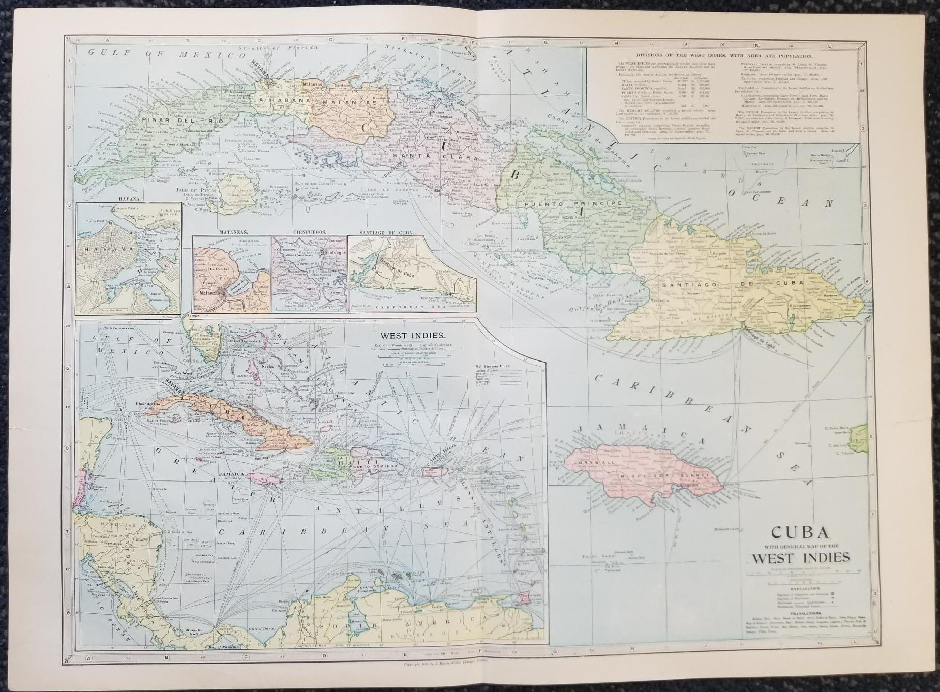 1899 — Map of Cuba with General Map of the West Indies — in Color — Measures 16″ x 22″