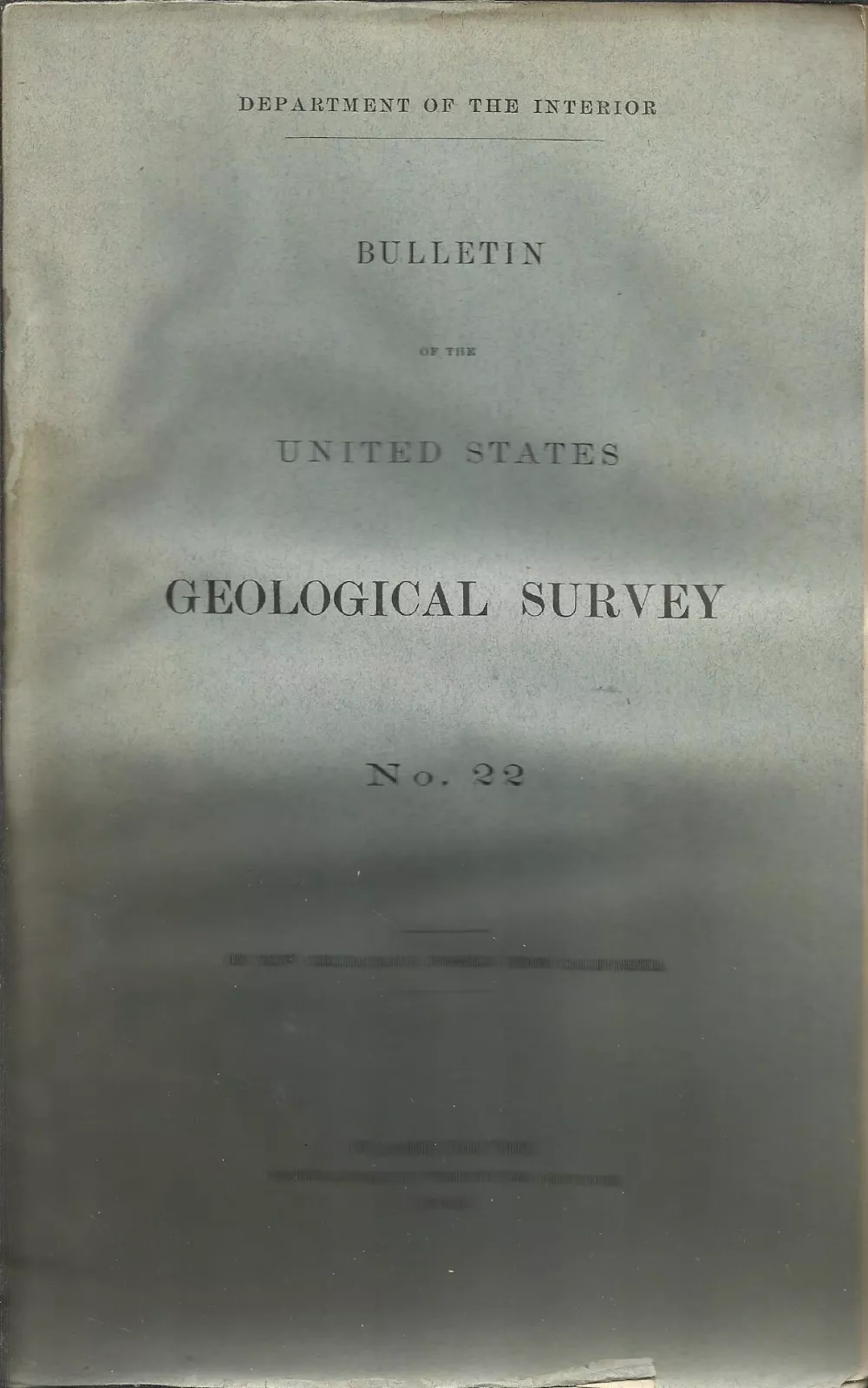 A bulletin published by the United States Geological Survey of the Department of the Interior in 1885. This issue, nuumber 22, contains: “On New Cretaceous Fossils from California”. Beautiful illustrations of fossils in the back of the book.…………….v111 Bx 101