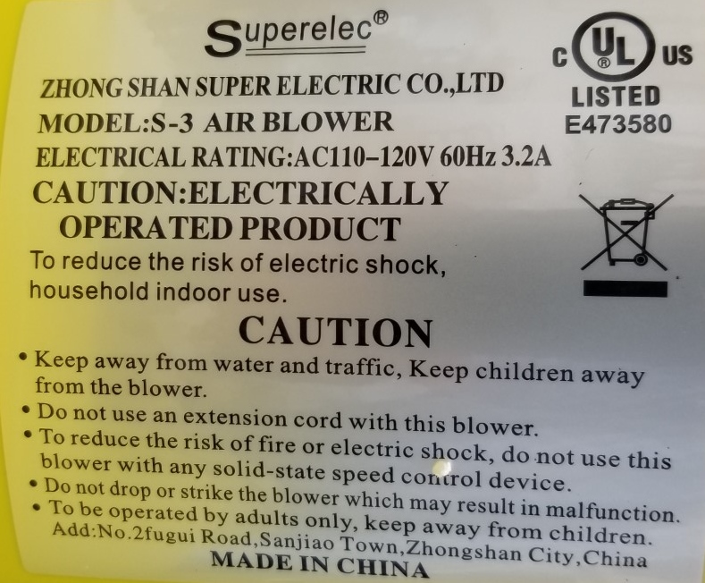 Zhong Shan Super Electric Co., LTD, Model: S-3 Air Blower; Electrical Rating: AC110-120V 60Hz 3.2A