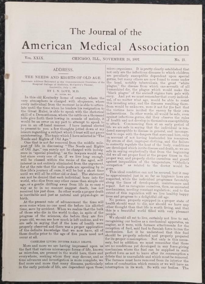 Single issue that had been disbound from a bound volume. Contains an address called THE NEEDS AND RIGHTS OF OLD AGE. pp.1033-1084. Very good used condition.