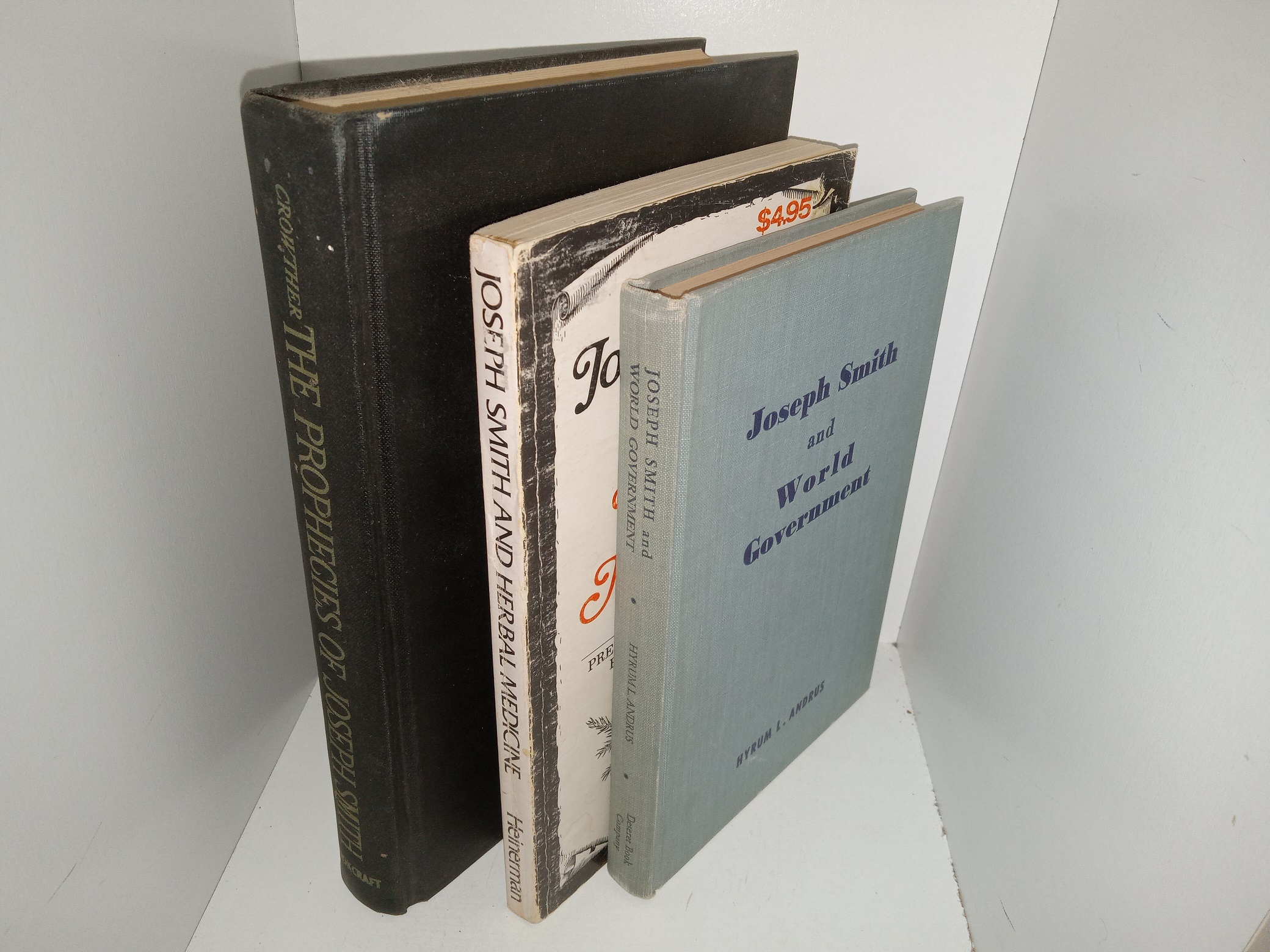3 fair condition books (2 hardcover w/ no dust jacket, and 1 softcover). The covers of the hardcovers have scuffing, fading, stains, small tears, and small dents, the pages have some yellowing, or small stains on the edges, the internal bindings may be slightly loose, and the front flyleaves have writing in pen and pencil. Pages 30-31 of Joseph Smith and World Government have stains caused by a piece of scrap paper inserted between them. Joseph Smith and Herbal medicine has heavy scuffing, wrinkling, stains, tears, and small creases on the edges of the cover; the internal binding is torn and loose; some pages have stains; and the title page has writing in pencil and eraser marks.