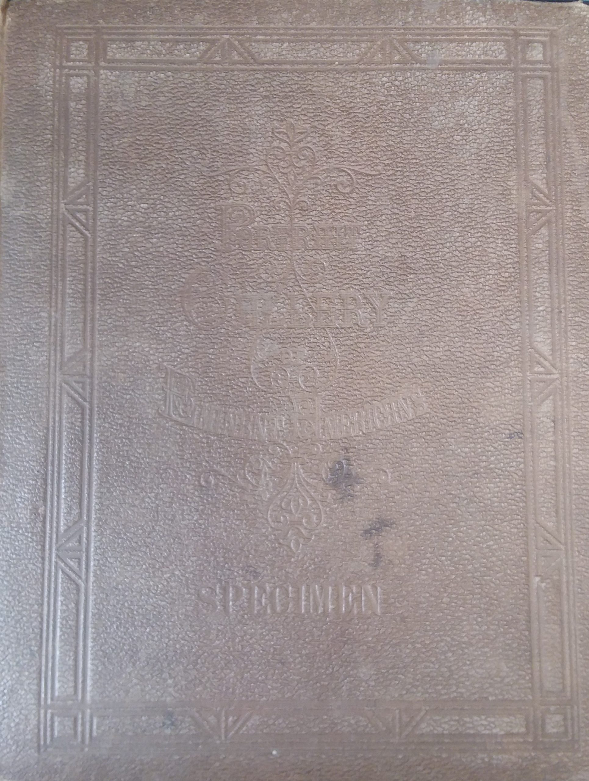 Large thin brown hardcover with faded lettering. Some shelf wear and minor stains on the front and back cover. The inside of the back cover exposes the spine where it is fraying. The Spine is folded and beginning to fray. There are some pencil markings on the flyleaf, but otherwise the text throughout is clean, clear, and legible. In fair condition.