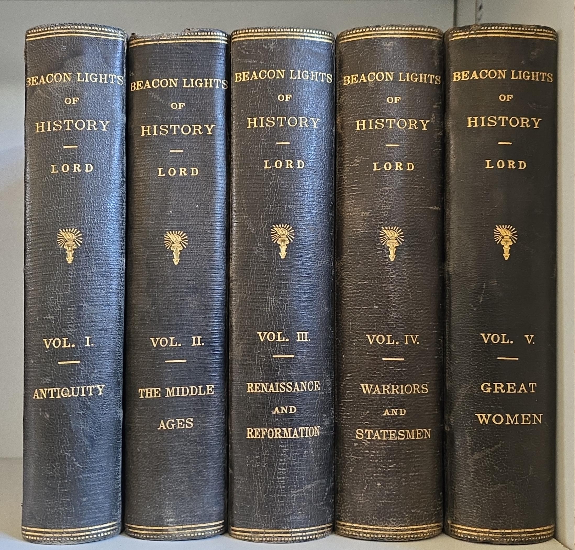 1883 — Beacon Lights of History — John Lord — 5 Volumes / 3/4 Leather Bindings