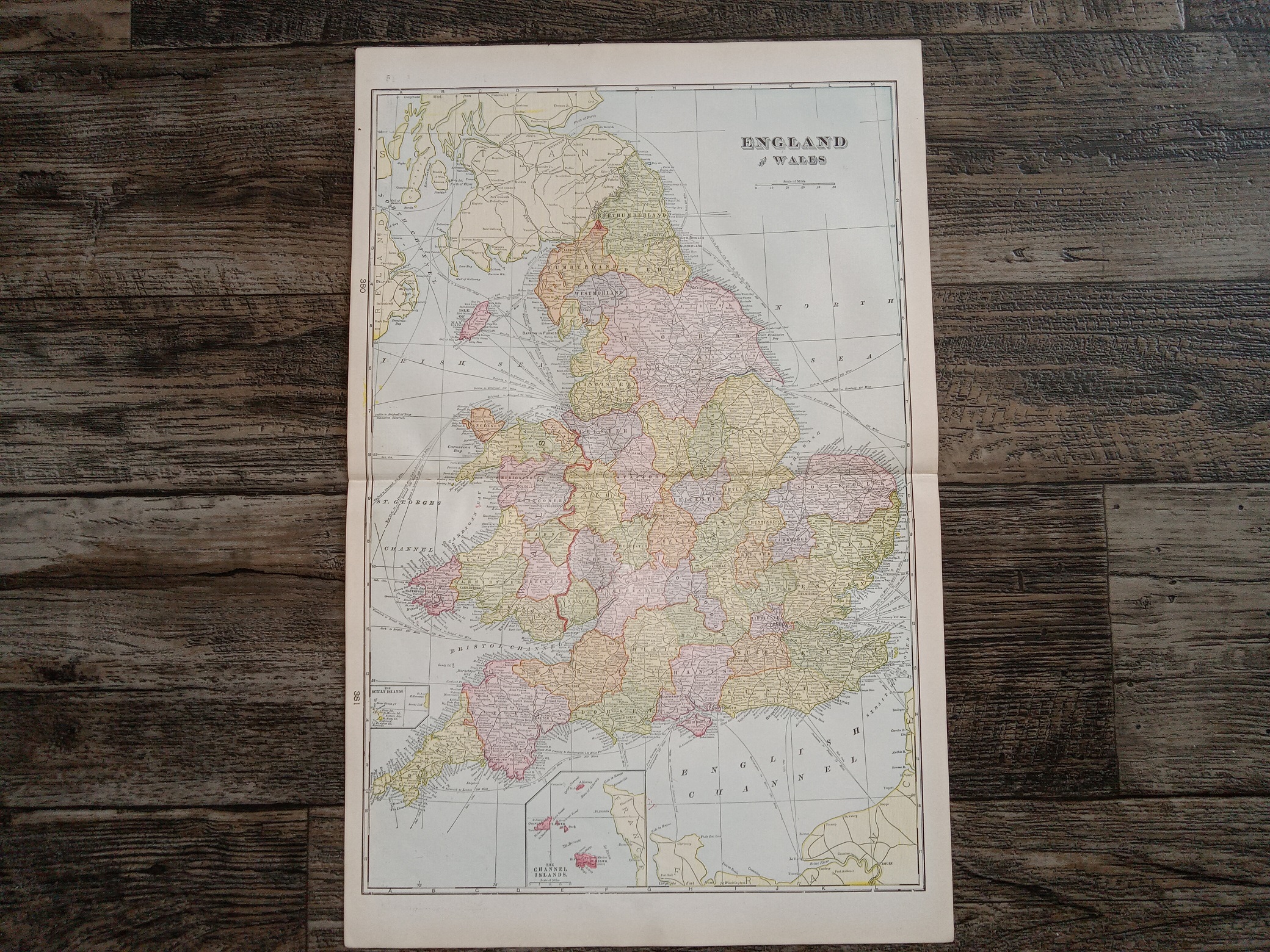 Map taken from a large, old atlas, 22 inches tall; 14 inches wide. Folded in half; good condition. The map has some tiny stains, ink bleeding, and there’s a little writing in pencil.